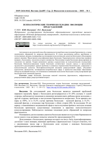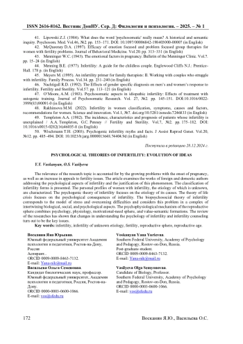 Актуальность исследуемой темы обусловлена ростом проблем в наступлении беременности, а также увеличением обращений по вопросам фертильности. В статье рассмотрены работы зарубежных и отечественных авторов, посвященные исследованию психологических аспектов бесплодия и обоснованию данного явления. Представлена классификация форм бесплодия. Характеризуются личностные профили женщин с бесплодием, этиология которого неизвестна. Психогенная теория бесплодия сфокусирована на этиологии его причин. Теория жизненного кризиса сосредоточена на психологических последствиях бесплодия. Биопсихосоциальная теория бесплодия соответствует модели стресса и преодолению трудностей и рассматривает данную проблему в комплексе переплетения биологических, социальных и психологических аспектов. Психофизиологический механизм репродуктивной сферы, объединяет психологию, физиологию, мотивационно-потребностную сферу и ценностно-смысловые образования. Обзор исследований показал, что изменения в понимания психологии бесплодия и консультирования при бесплодии носят ключевой характер.