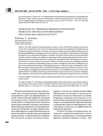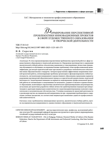 В статье проанализирована перспективная проблематика проектной работы в сфере художественного образования и творческой деятельности. Определены противоречия в содержании аналитической учебной работы относительно выявления и стимулирования личностных инициатив обучающихся и обучающих, исследованы болевые проблемные точки профессиональной деквалификации, рассмотрен практический опыт при анализе и разработке технологического обеспечения новых образовательных стандартов. Автором представлены эффективные направления опытной проектной работы, оптимизирующие проблемы организации и функционирования учебной деятельности, систематизации непрерывного художественного образования; предложены варианты разрешения противоречий образовательного процесса в практической художественно творческой деятельности. Акцентировано внимание на вариантах моделирования профессиональной проектной работы по оптимизации и соподчиненности начального, среднего и высшего художественного образования, включающего перспективы аналитического функционирования антропопрактик, актуальных для проектных разработок гибких личностно ориентированных подходов при конкретизации и адаптации индикаторов компетентности в практико-ориентированных психолого- педагогических и исполнительских обстоятельствах. Уточнены возможности проектной деятельности в реализации научно исследовательской направленности при определении проблематики и содержания учебных дисциплин, их соответствия индикаторам выявления сущности профессиональной компетентности.