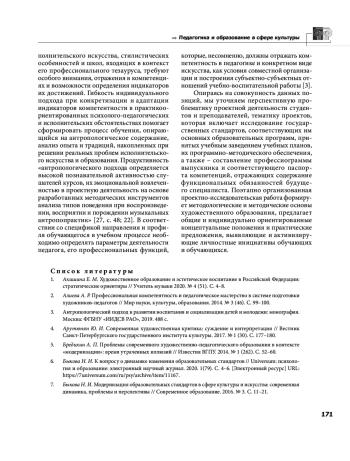 1. Акишина Е. М. Художественное образование и эстетическое воспитание в Российской Федерации: стратегические ориентиры // Учитель музыки 2020. № 4 (51). С. 4-8.