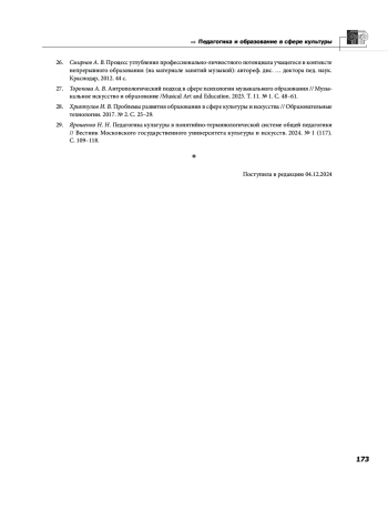 29. Ярошенко Н. Н. Педагогика культуры в понятийно терминологической системе общей педагогики // Вестник Московского государственного университета культуры и искусств. 2024. № 1 (117). С. 109-118. EDN: HWJEAG