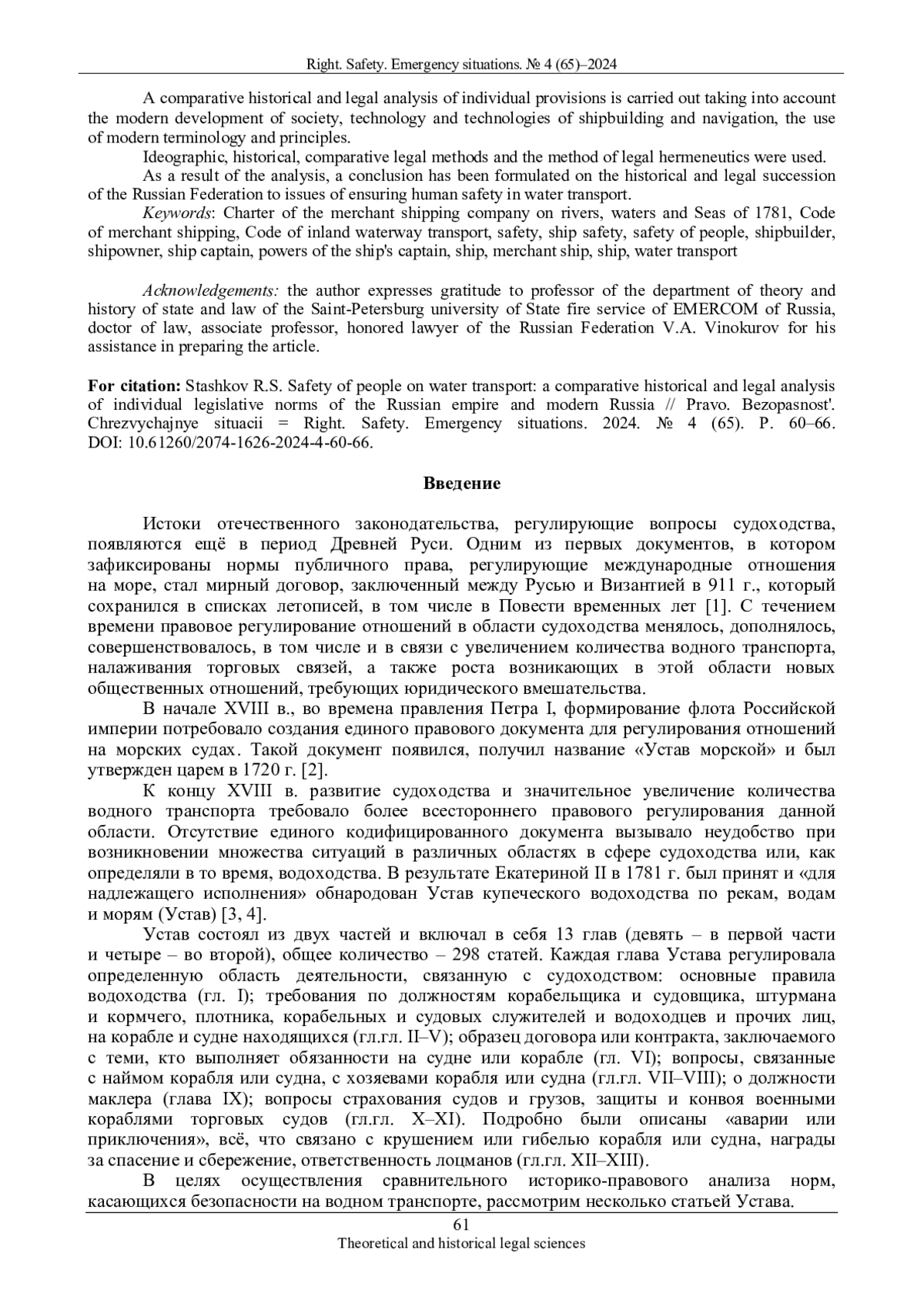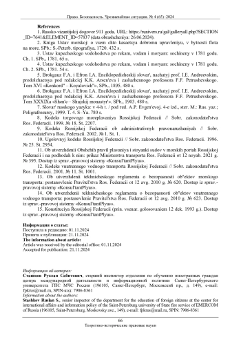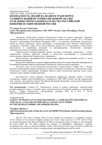 Рассмотрены вопросы безопасности людей на водном транспорте. Проведен сравнительный анализ Устава купеческого водоходства по рекам водам и морям 1781 г. и Кодекса торгового мореплавания Российской Федерации 1999 г. по вопросам обеспечения безопасности людей на водном транспорте. Автор анализирует в нормативных актах понятия «корабельщик», «судовщик», «капитан», нормы об их ответственности, нормы об их полномочиях в случае угрозы безопасности и назначению наказаний за правонарушения, обеспечению санитарно-эпидемиологической и пожарной безопасности. Сравнительный историко-правовой анализ отдельных положений осуществлен с учетом современного развития общества, техники и технологий судостроения и судовождения, использования современной терминологии и принципов. Использовались идеографический, исторический, сравнительно-правовой методы и метод юридической герменевтики. В результате проведенного анализа сформулирован вывод об историко-правовом правопреемстве Российской Федерации вопросов обеспечения безопасности людей на водном транспорте.