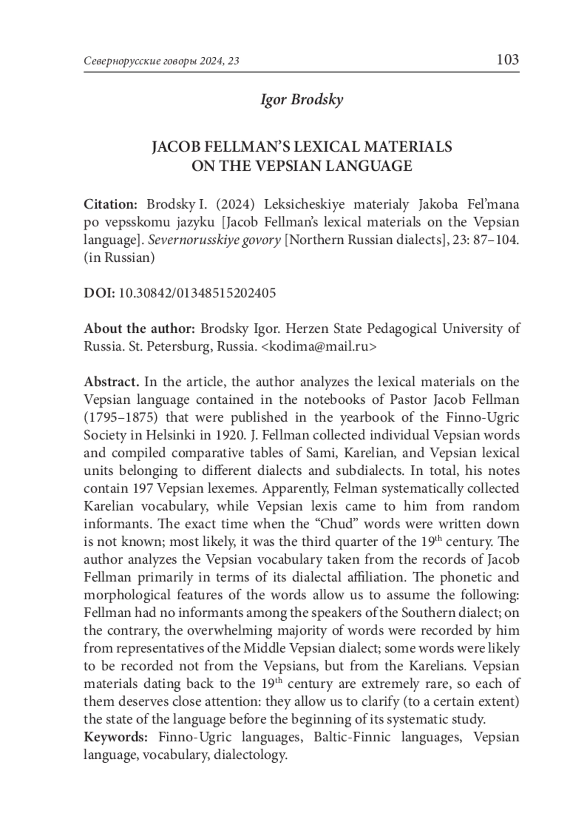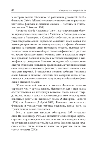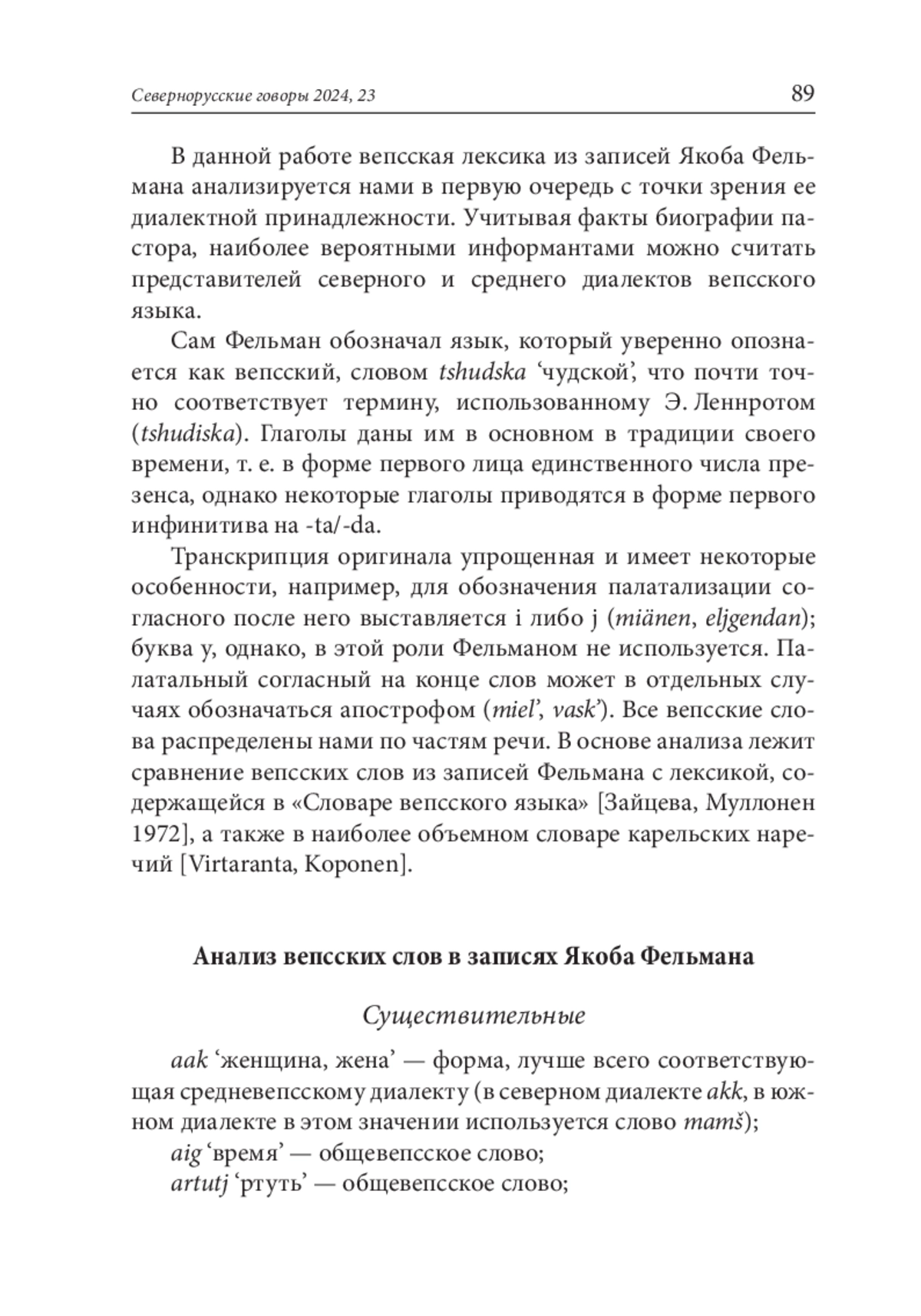 предлагаемой статье автор анализирует лексические материалы на вепсском языке, содержащиеся в записных книжках пастора Якоба Фельмана (1795–1875) и изданные в 1920 г. ежегоднике Финно-угорского общества в Хельсинки. Я. Фельман записывал отдельные вепсские слова, а также составлял сравнительные таблицы саамских, карельских и вепсских слов, относящихся к разным диалектам и говорам. Всего в его записях представлено 197 вепсских лексем. В данной работе автор проводит их диалектологический анализ с целью выяснения диалектной принадлежности информантов Я. Фельмана. Фонетические и морфологические особенности слов позволяют предположить следующее: у Фельмана не было информантов из числа носителей южного диалекта; напротив, подавляющее большинство слов записано им от представителей средневепсского диалекта; часть слов, скорее всего, записана не от вепсов, а от карел.