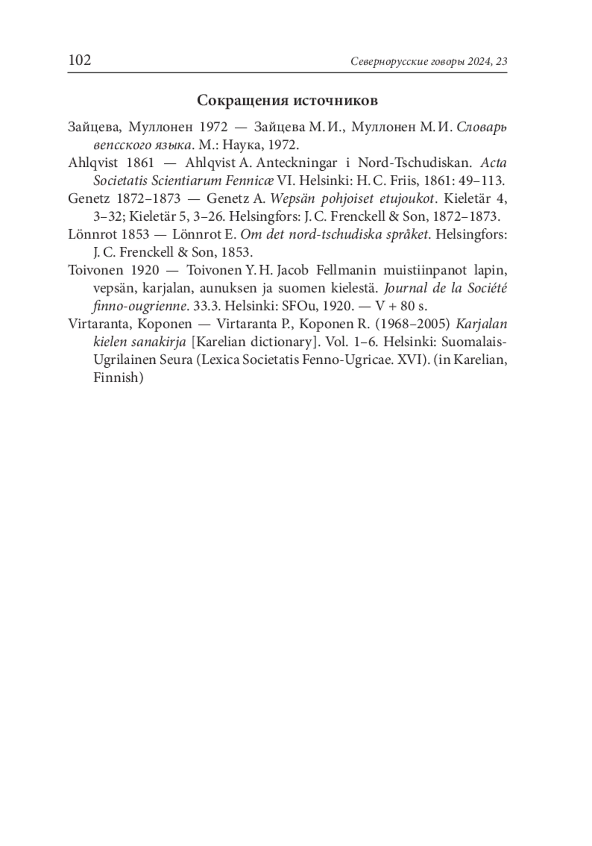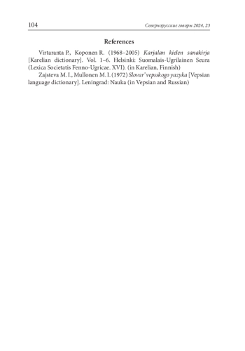 2. Virtaranta P., Koponen R. (1968-2005) Karjalan kielen sanakirja [Karelian dictionary]. Vol. 1-6. Helsinki: Suomalais-Ugrilainen Seura (Lexica Societatis Fenno-Ugricae. XVI). (in Karelian, Finnish).