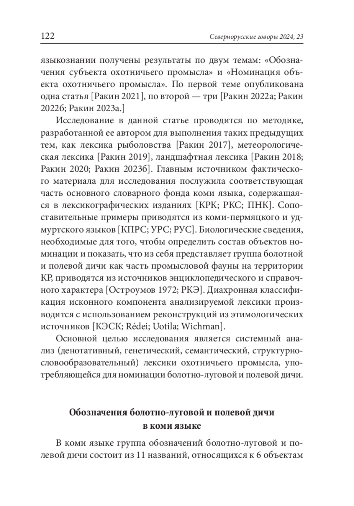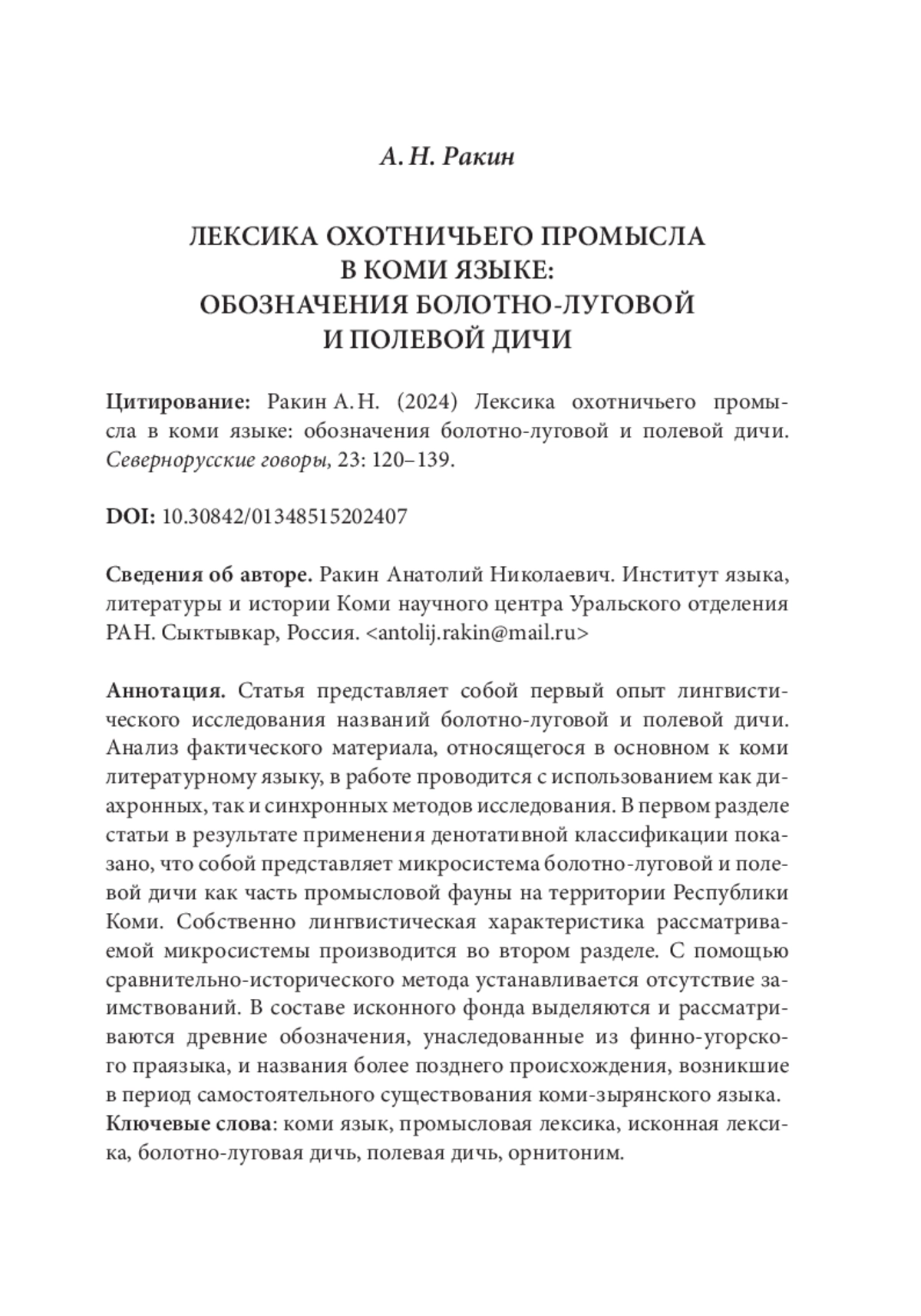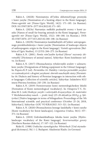 10. Ракин А. Н. (2023а) Названия мелких пушных зверей в коми языке. Финно-угорский мир, 15 (2): 180-188. 10.15507/2076- 2577.014.2022.02.171-185. DOI: 10.15507/2076-2577.014.2022.02.171-185