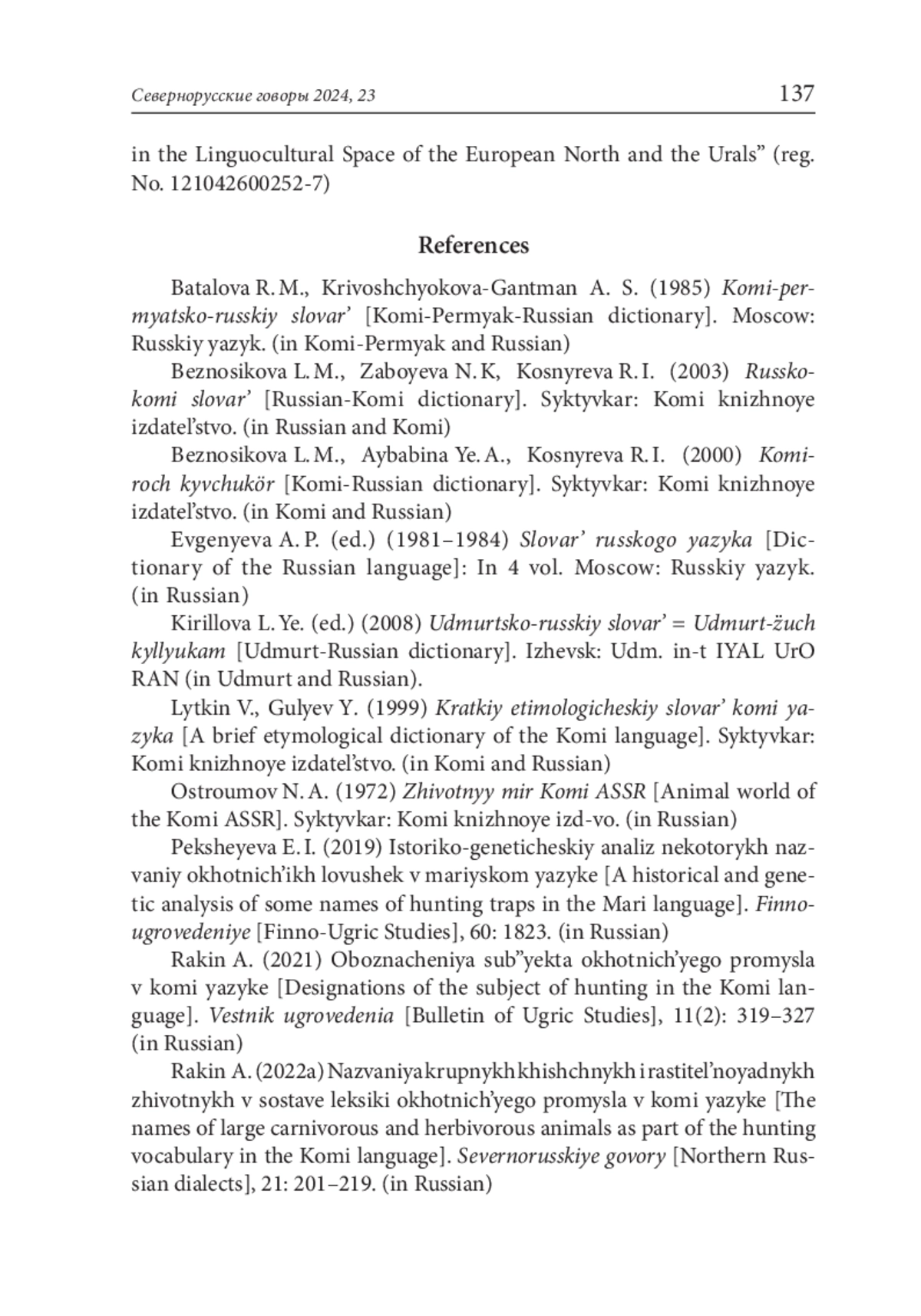 8. Ракин А. Н. (2022а) Названия крупных хищных и растительноядных животных в составе лексики охотничьего промысла в коми языке. Севернорусские говоры, 21: 201-219.