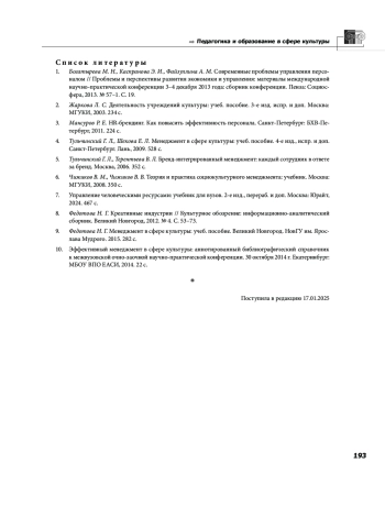 4. Тульчинский Г. Л., Шекова Е. Л. Менеджмент в сфере культуры: учеб. пособие. 4-е изд., испр. и доп. Санкт-Петербург. Лань, 2009. 528 с. EDN: QXSLXN