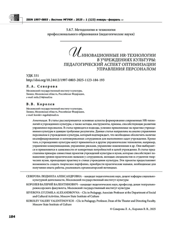 В статье рассматриваются основные аспекты формирования современных HR технологий в учреждениях культуры, а также методы, инструменты, приемы, способствующие развитию управления персоналом. В статье приводятся подходы, успешно применяемые на практике учреждениями культуры и дающие требуемые результаты. Данная статья направлена на анализ управления персоналом в учреждениях культуры, который подтверждает, что необходимо обеспечить наличие квалифицированных и мотивированных сотрудников для выполнения задач учреждения. Кроме того, в учреждениях культуры могут применяться и другие управленческие технологии, например, управление коммуникациями, управление рисками, управление изменениями и др. Они выбираются и применяются в зависимости от конкретных потребностей и целей учреждения. В статье представлены примеры совместных проектов учреждений культуры и вузов, которые способствуют повышению уровня практических навыков у сотрудников, молодых специалистов и студентов творческих вузов, проходящих практику в стенах учреждения культуры. Эти проекты предоставляют возможность создать творческое портфолио, приобрести практические навыки, необходимые для получения опыта работы, реализовать организаторский потенциал.