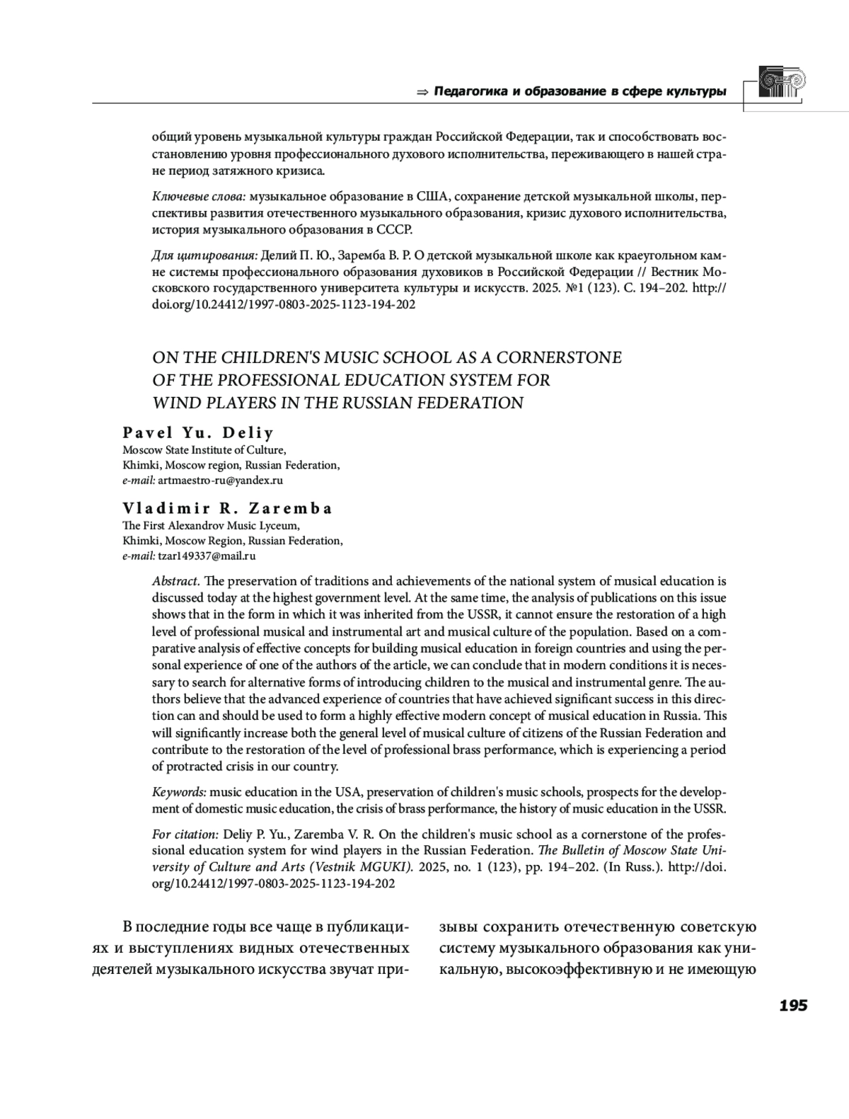 4. Делий П. Ю., Заремба В. Р., Музыкальное образование и воспитание в общеобразовательных школах США: наблюдения и интроспекция педагогического опыта // Образование и культурное пространство. 2024. № 4. С 60-69. EDN: MZCGFQ