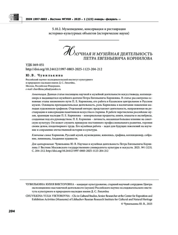 Данная статья посвящена научной и музейной деятельности искусствоведа, коллекционера и выдающегося музейного деятеля Петра Евгеньевича Корнилова. В статье рассмотрены основные этапы жизненного пути П. Е. Корнилова, его работа в Казанском центральном и Русском музеях. Освящена преподавательская деятельность, роль Корнилова в воспитании поколения молодых художников графиков. Отдельный интерес представляет деятельность, направленная на реставрацию и консервацию памятников искусства и старины. В работе перечислены российские музеи, хранящие наследие П. Е. Корнилова мемориальные предметы, книги, плакаты и экслибрисы, созданные под его руководством. П. Е. Корнилов личность, оказавшая большое влияние на советскую культуру. Он может служить примером постоянного профессионального развития, горения своим делом, плодотворного труда. Его музейная работа задел для будущих поколений на изучение и сохранение отечественной истории и культуры.