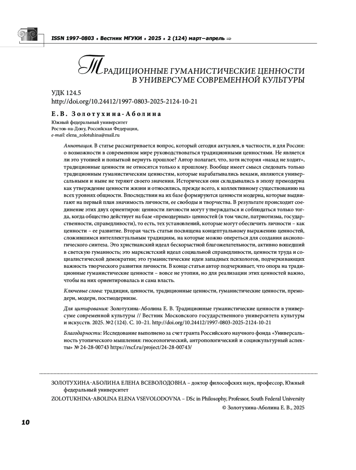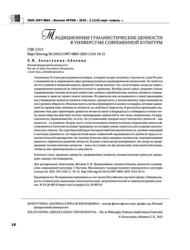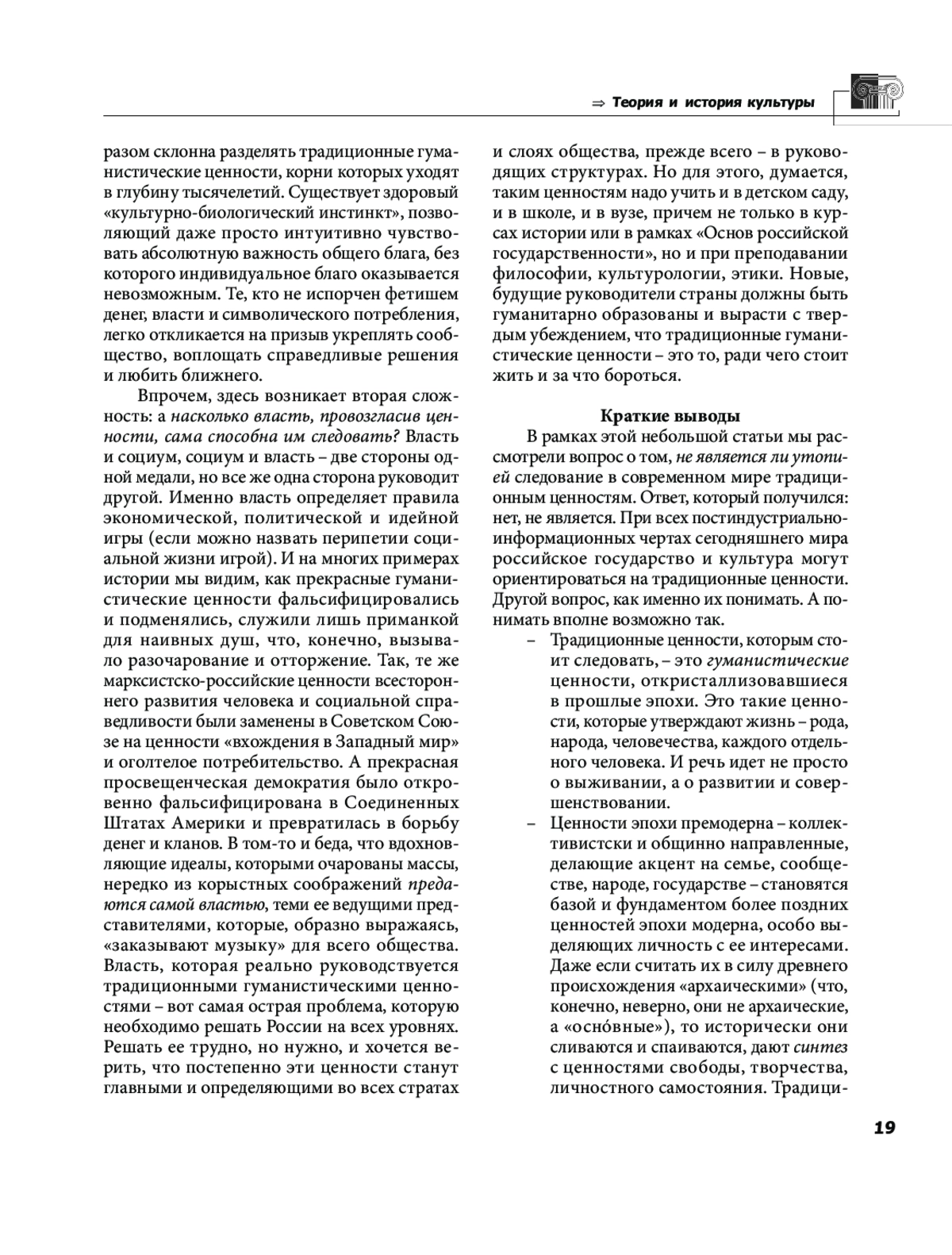 В статье рассматривается вопрос, который сегодня актуален, в частности, и для России: о возможности в современном мире руководствоваться традиционными ценностями. Не является ли это утопией и попыткой вернуть прошлое? Автор полагает, что, хотя история «назад не ходит», традиционные ценности не относятся только к прошлому. Вообще имеет смысл следовать только традиционным гуманистическим ценностям, которые нарабатывались веками, являются универсальными и ныне не теряют своего значения. Исторически они складывались в эпоху премодерна как утверждение ценности жизни и относились, прежде всего, к коллективному существованию на всех уровнях общности. Впоследствии на их базе формируются ценности модерна, которые выдвигают на первый план значимость личности, ее свободы и творчества. В результате происходит соединение этих двух ориентиров: ценности личности могут утверждаться и соблюдаться только тогда, когда общество действует на базе «премодерных» ценностей (в том числе, патриотизма, государственности, справедливости), то есть, тех установлений, которые могут обеспечить личности как ценности ее развитие. Вторая часть статьи посвящена концептуальному выражению ценностей, сложившимся интеллектуальным традициям, на которые можно опереться для создания аксиоло гического синтеза. Это христианский идеал бескорыстной благожелательности, активно вошедший в светскую гуманность; это марксистский идеал социальной справедливости, ценности труда и социалистической демократии; это гуманистические идеи западных психологов, подчеркивающих важность творческого развития личности. В конце статьи автор подчеркивает, что опора на традиционные гуманистические ценности вовсе не утопия, но для реализации этих ценностей важно, чтобы на них ориентировалась и сама власть.