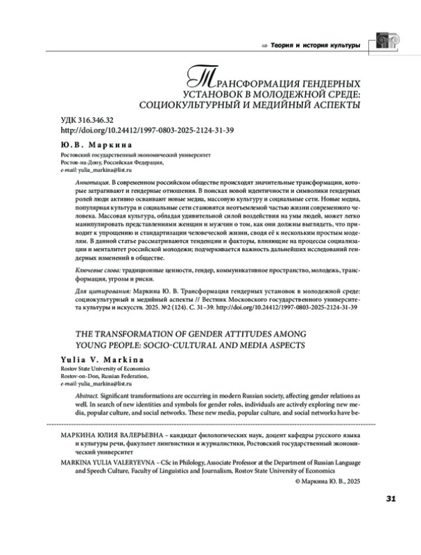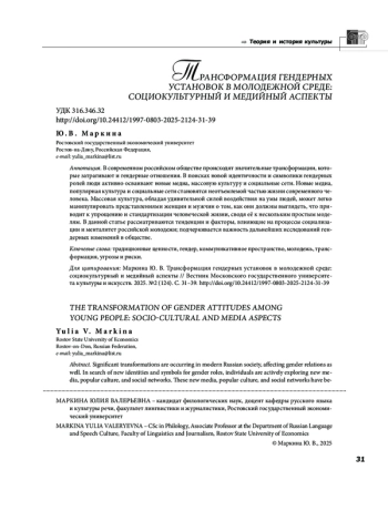 В современном российском обществе происходят значительные трансформации, которые затрагивают и гендерные отношения. В поисках новой идентичности и символики гендерных ролей люди активно осваивают новые медиа, массовую культуру и социальные сети. Новые медиа, популярная культура и социальные сети становятся неотъемлемой частью жизни современного человека. Массовая культура, обладая удивительной силой воздействия на умы людей, может легко манипулировать представлениями женщин и мужчин о том, как они должны выглядеть, что приводит к упрощению и стандартизации человеческой жизни, сводя её к нескольким простым моделям. В данной статье рассматриваются тенденции и факторы, влияющие на процессы социализации и менталитет российской молодежи; подчеркивается важность дальнейших исследований гендерных изменений в обществе.