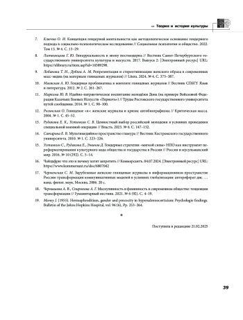 18. Чернышева А. В., Спирюгова А. Г. Маскулинность и феминность в современном обществе: тенденции трансформации // Гуманитарный вестник. 2021. № 6 (92). С. 4-19.