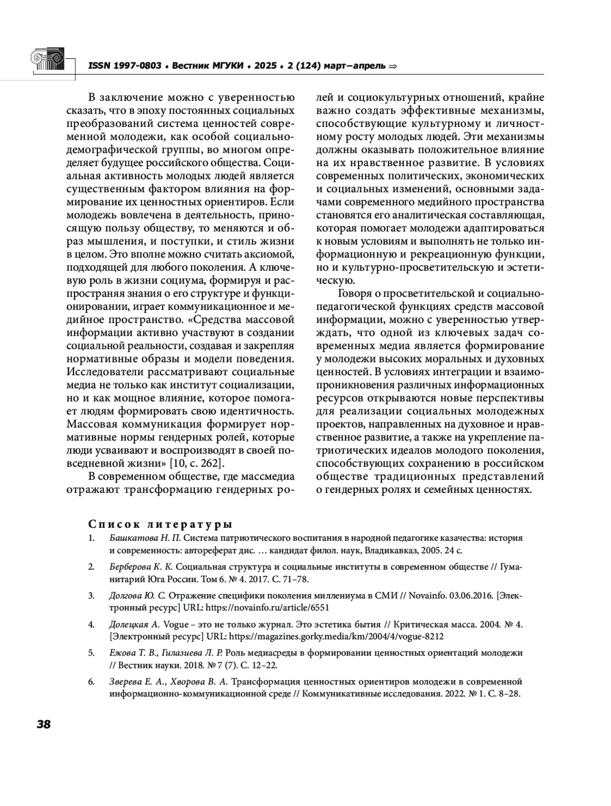 6. Зверева Е. А., Хворова В. А. Трансформация ценностных ориентиров молодежи в современной информационно коммуникационной среде // Коммуникативные исследования. 2022. № 1. С. 8-28. EDN: ADFVBN