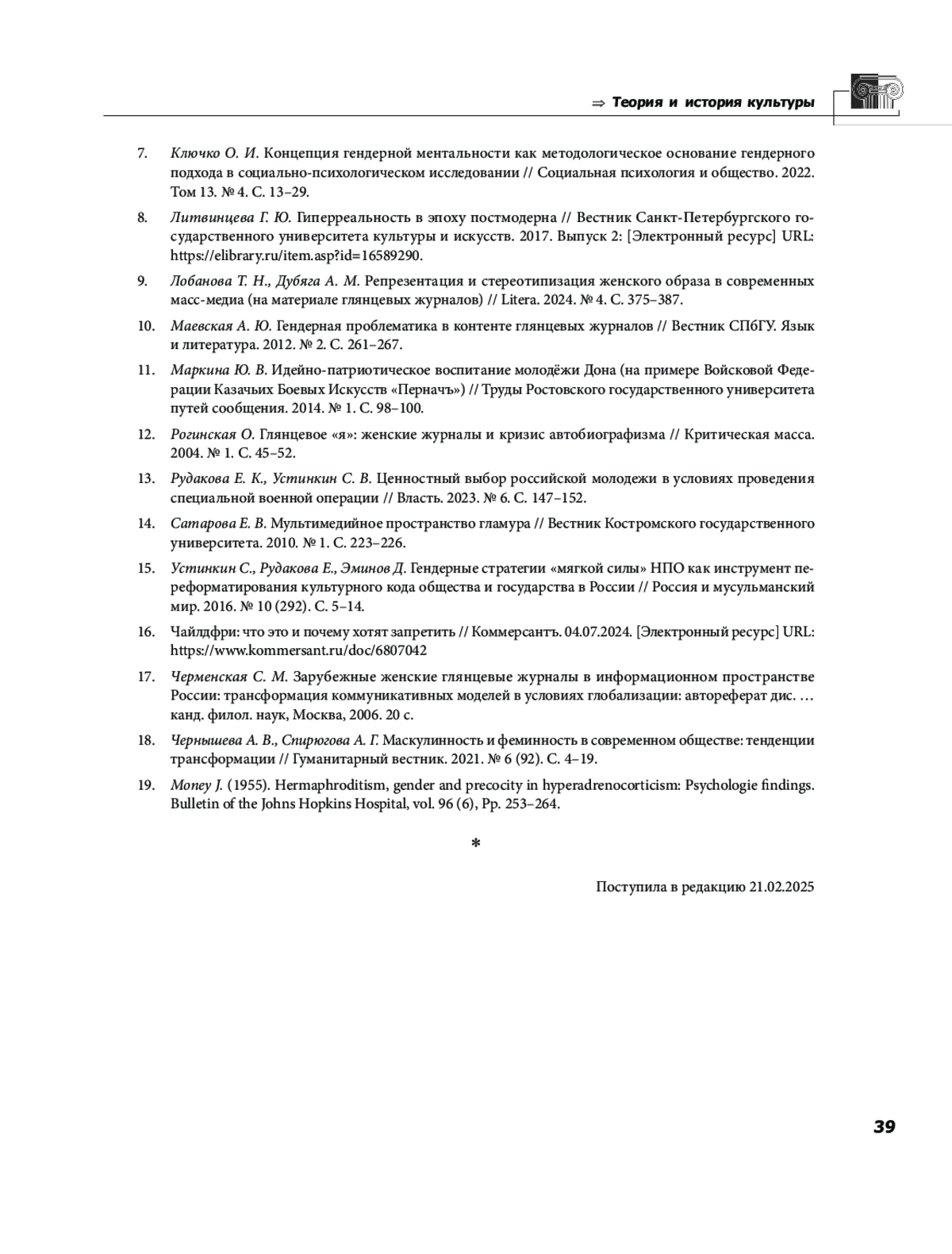 10. Маевская А. Ю. Гендерная проблематика в контенте глянцевых журналов // Вестник СПбГУ. Язык и литература. 2012. № 2. С. 261-267.