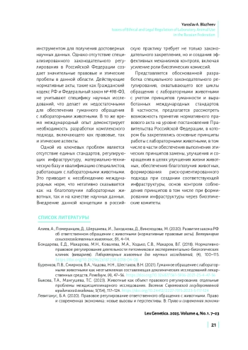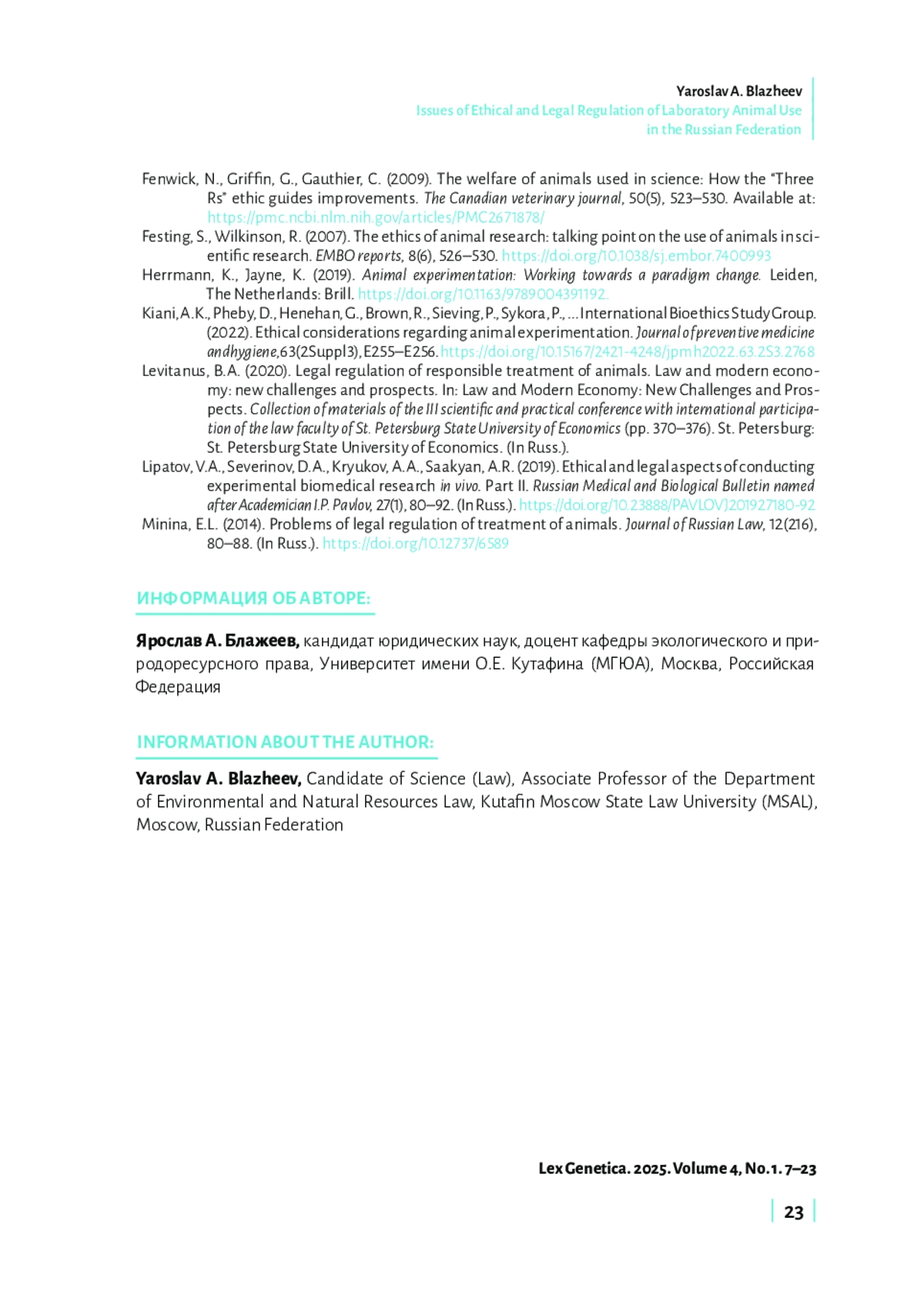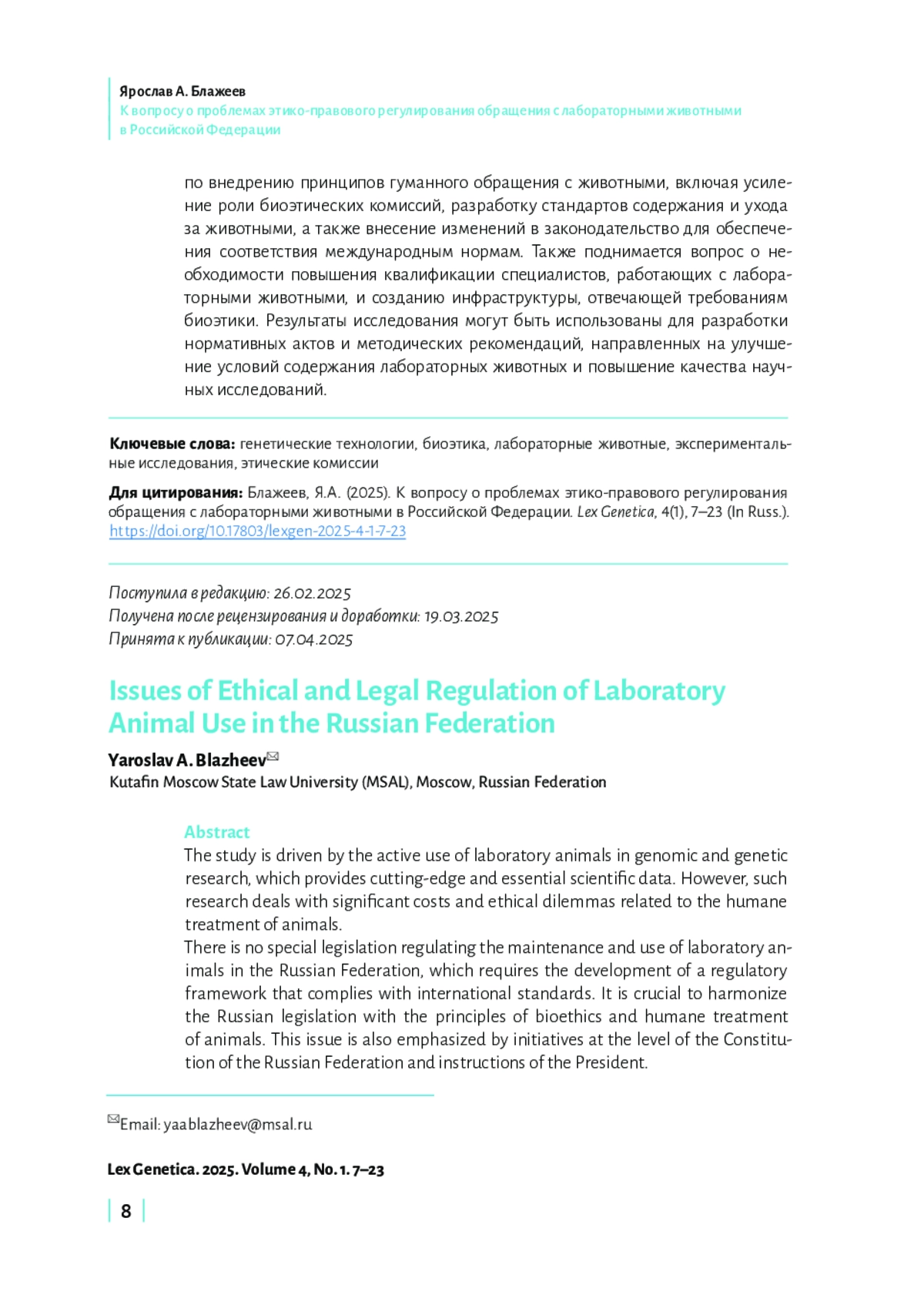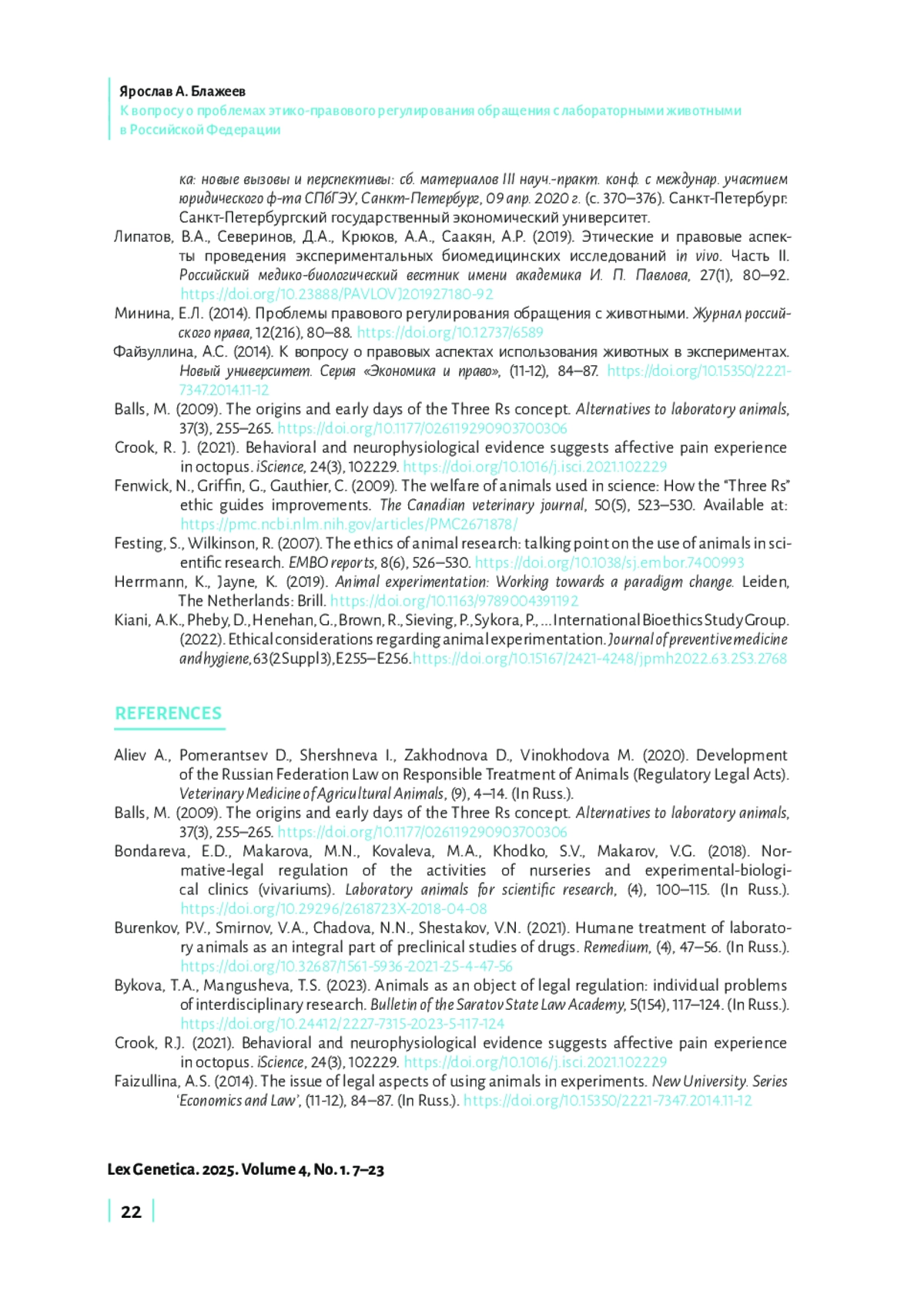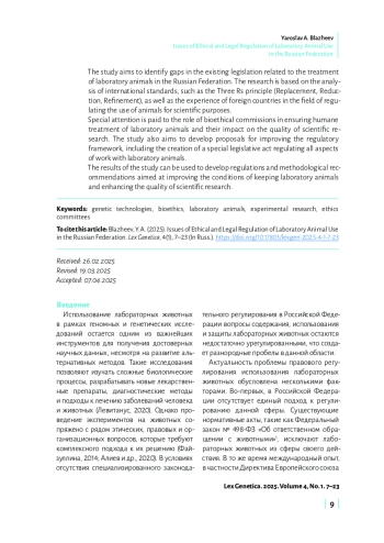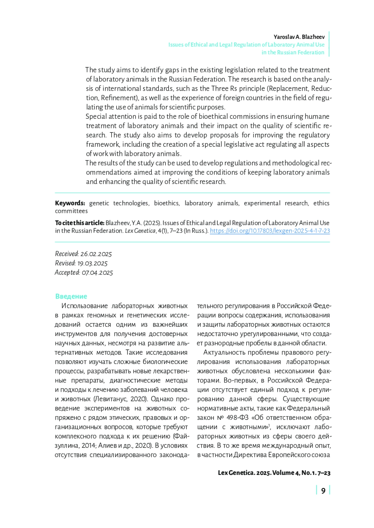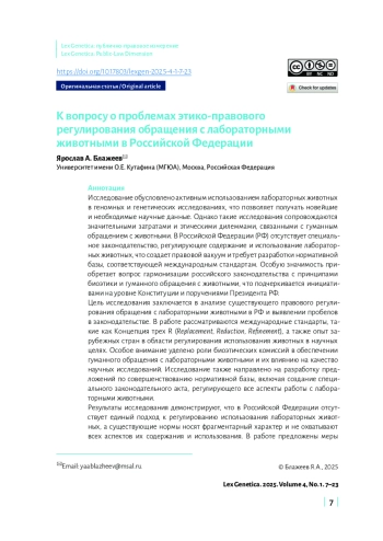 Исследование обусловлено активным использованием лабораторных животных в геномных и генетических исследованиях, что позволяет получать новейшие и необходимые научные данные. Однако такие исследования сопровождаются значительными затратами и этическими дилеммами, связанными с гуманным обращением с животными. В Российской Федерации (РФ) отсутствует специальное законодательство, регулирующее содержание и использование лабораторных животных, что создает правовой вакуум и требует разработки нормативной базы, соответствующей международным стандартам. Особую значимость приобретает вопрос гармонизации российского законодательства с принципами биоэтики и гуманного обращения с животными, что подчеркивается инициативами на уровне Конституции и поручениями Президента РФ. Цель исследования заключается в анализе существующего правового регулирования обращения с лабораторными животными в РФ и выявлении пробелов в законодательстве. В работе рассматриваются международные стандарты, такие как Концепция трех R (Replacement, Reduction, Refinement), а также опыт зарубежных стран в области регулирования использования животных в научных целях. Особое внимание уделено роли биоэтических комиссий в обеспечении гуманного обращения с лабораторными животными и их влиянию на качество научных исследований. Исследование также направлено на разработку предложений по совершенствованию нормативной базы, включая создание специального законодательного акта, регулирующего все аспекты работы с лабораторными животными. Результаты исследования демонстрируют, что в Российской Федерации отсутствует единый подход к регулированию использования лабораторных животных, а существующие нормы носят фрагментарный характер и не охватывают всех аспектов их содержания и использования. В работе предложены меры по внедрению принципов гуманного обращения с животными, включая усиление роли биоэтических комиссий, разработку стандартов содержания и ухода за животными, а также внесение изменений в законодательство для обеспечения соответствия международным нормам. Также поднимается вопрос о необходимости повышения квалификации специалистов, работающих с лабораторными животными, и созданию инфраструктуры, отвечающей требованиям биоэтики. Результаты исследования могут быть использованы для разработки нормативных актов и методических рекомендаций, направленных на улучшение условий содержания лабораторных животных и повышение качества научных исследований.