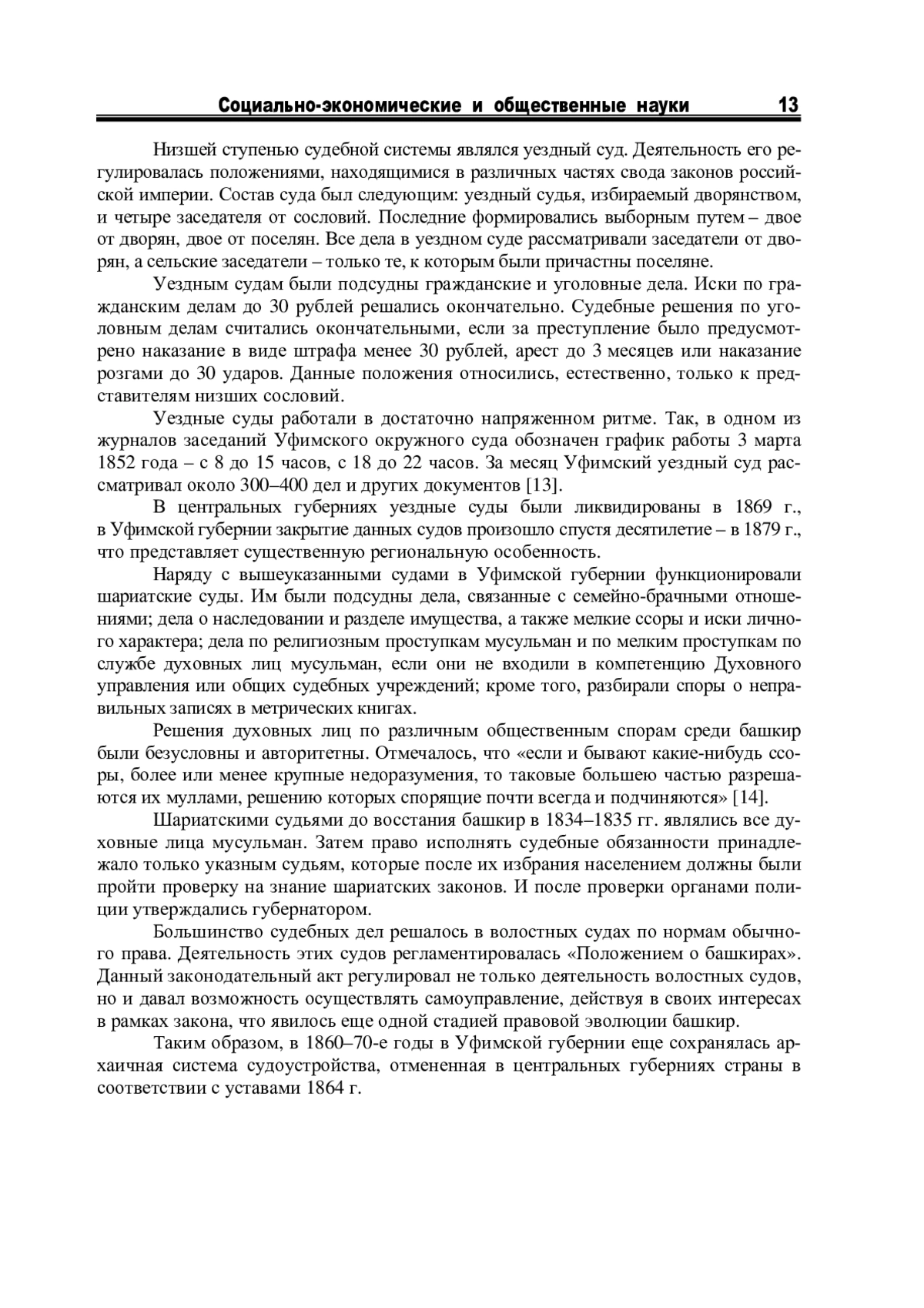 В статье рассматриваются вопросы, связанные с проведением судебной реформы в Уфимской губернии во второй половине XIX в. Особое внимание уделяется проблемам функционирования волостных судов, третейских судов по совести, шариатских судов, словесных судов и общих судебных учреждений. Исследованы вопросы судебной деятельности в различных областях государственной и общественной жизни