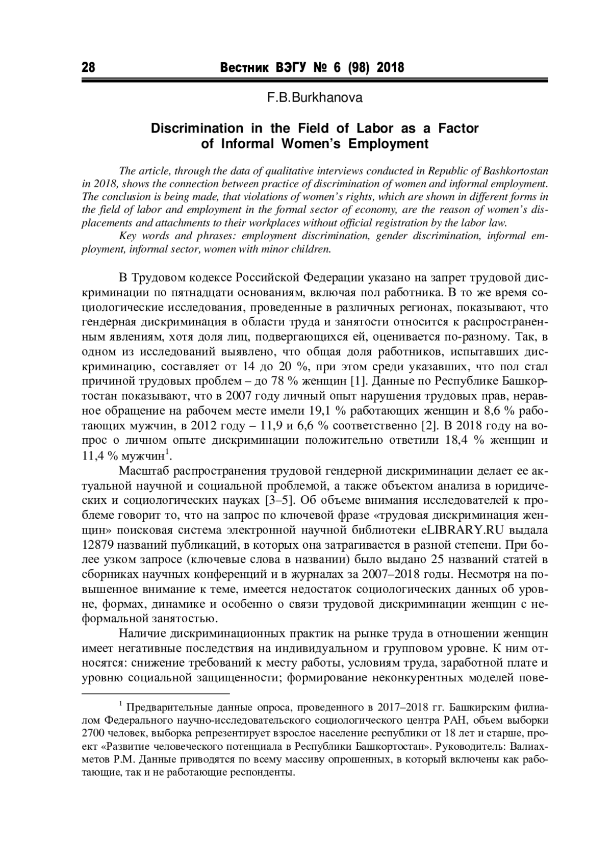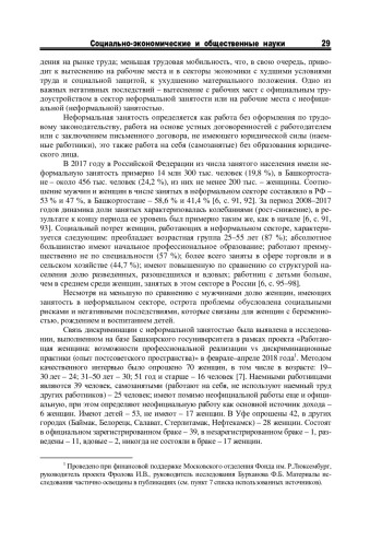 В статье на данных качественных интервью, проведенных в Башкортостане в 2018 году, показывается связь практик дискриминации женщин с неформальной занятостью. Делается вывод, что проявляющиеся в разных формах нарушения прав женщин в области труда и занятости в формальном секторе экономики, являются причиной их вытеснения и закрепления на рабочих местах без официального оформления по трудовому законодательству
