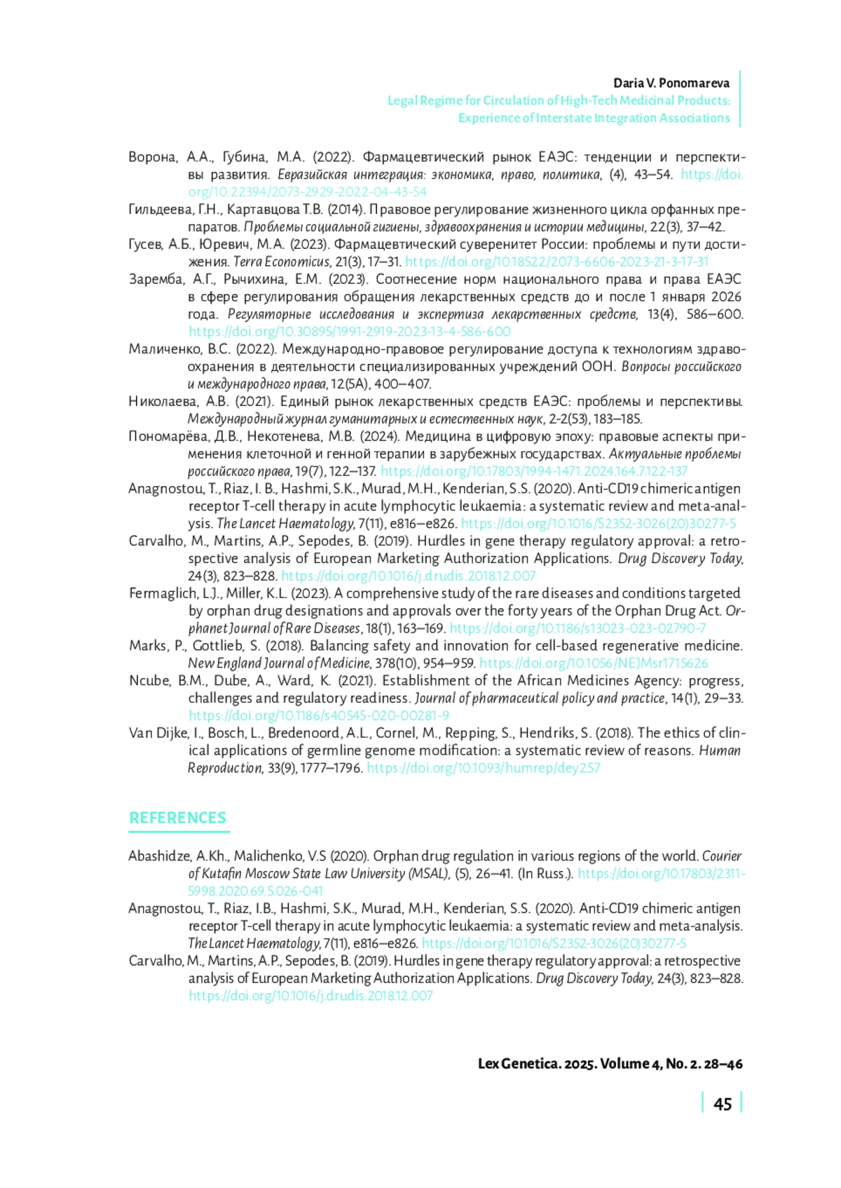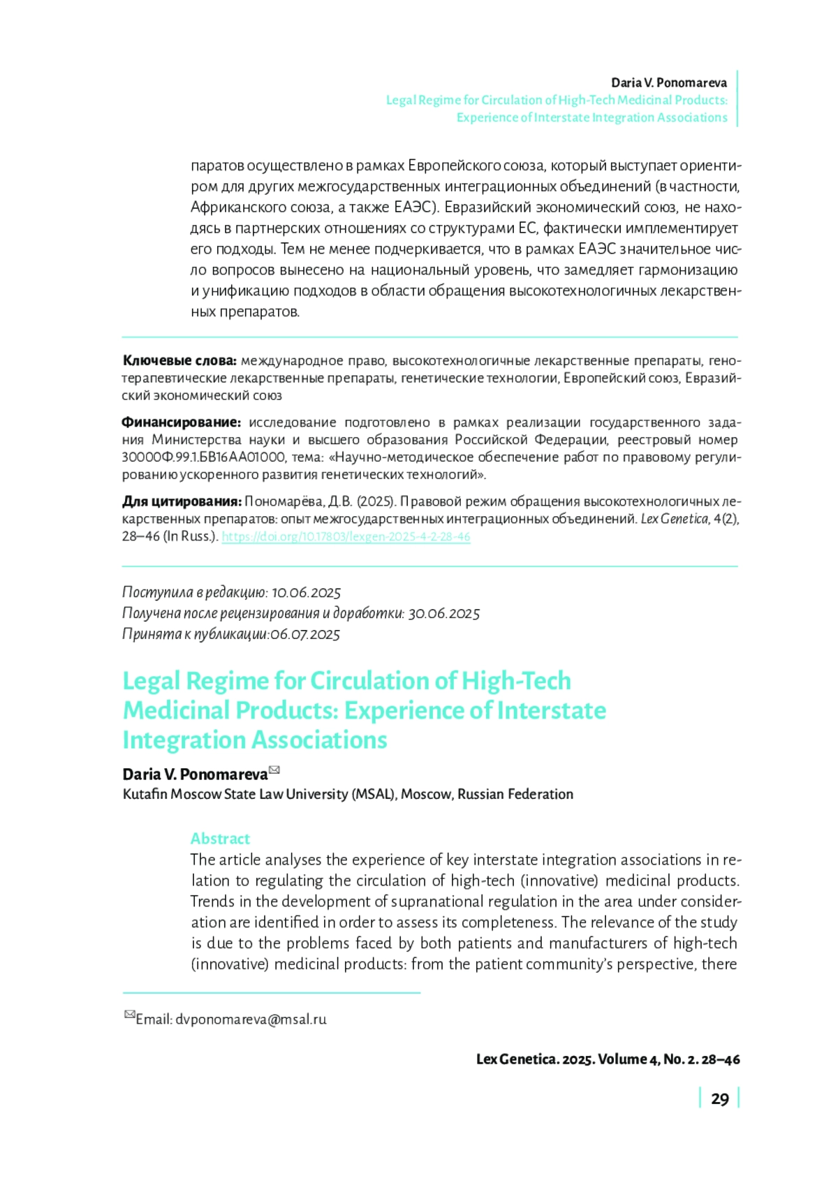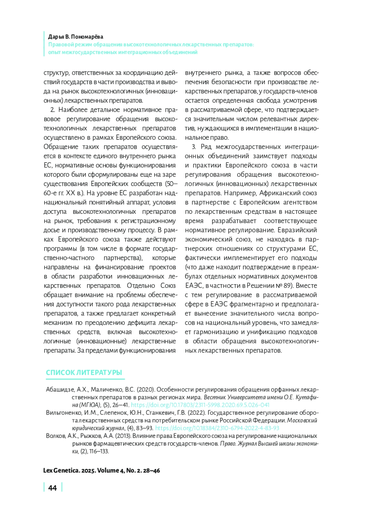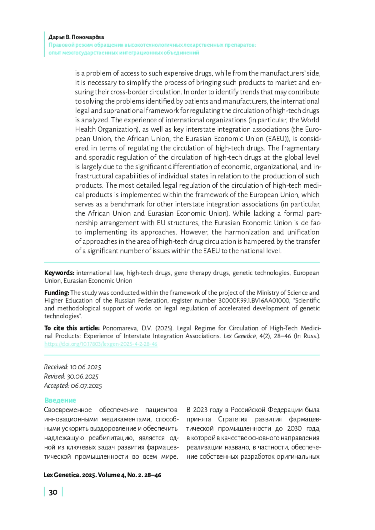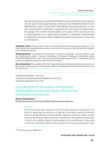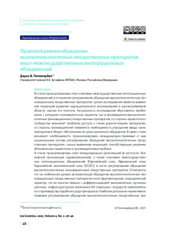 В статье проанализирован опыт ключевых межгосударственных интеграционных объединений в отношении регулирования обращения высокотехнологичных (инновационных) лекарственных препаратов. Целью исследования является выявление тенденций развития наднационального регулирования в рассматриваемой области, оценка его полноты. Актуальность исследования обусловлена проблемами, с которыми сталкиваются как пациенты, так и производители высокотехнологичных (инновационных) лекарственных препаратов: со стороны пациентского сообщества возникает проблема доступа к таким дорогостоящим препаратам; со стороны производителей появляется необходимость упрощения ввода таких препаратов в оборот, обеспечение их трансграничного обращения. В связи с этим возникает необходимость проанализировать международно-правовые и наднациональные основы регулирования обращения высокотехнологичных лекарственных препаратов с целью выявления тенденций, способствующих решению обозначенных пациентами и производителями проблем. В статье проанализирован опыт международных организаций (в частности, Всемирной организации здравоохранения), а также ключевых межгосударственных интеграционных объединений (Европейский союз, Африканский союз, Евразийский экономический союз (ЕАЭС)) в части регулирования обращения высокотехнологичных (инновационных) лекарственных препаратов. Отмечается, что на глобальном уровне регламентация обращения высокотехнологичных (инновационных) лекарственных препаратов носит фрагментарный, спорадический характер, что во многом связано с дифференциацией экономических, организационных, инфраструктурных возможностей отдельных государств применительно к производству подобного рода препаратов. Наиболее детальное нормативное правовое регулирование обращения высокотехнологичных лекарственных препаратов осуществлено в рамках Европейского союза, который выступает ориентиром для других межгосударственных интеграционных объединений (в частности, Африканского союза, а также ЕАЭС). Евразийский экономический союз, не находясь в партнерских отношениях со структурами ЕС, фактически имплементирует его подходы. Тем не менее подчеркивается, что в рамках ЕАЭС значительное число вопросов вынесено на национальный уровень, что замедляет гармонизацию и унификацию подходов в области обращения высокотехнологичных лекарственных препаратов.