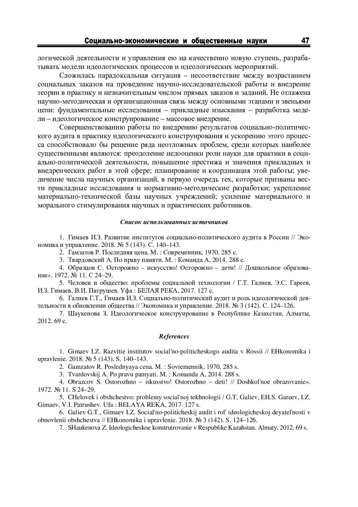 6. Галиев Г.Т., Гимаев И.З. Социально-политический аудит и роль идеологической деятельности в обновлении общества // Экономика и управление. 2018. № 3 (142). С. 124-126.