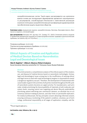Статья посвящена комплексному анализу этических аспектов создания, применения и утилизации медицинских изделий на основе наноробототехники. Авторы выявляют и систематизируют ключевые правовые и деонтологические проблемы, возникающие на стыке стремительного технологического прогресса в области наномедицины, что создает опасный регуляторный вакуум. Основное внимание уделено разработке системы фундаментальных этических принципов, регулирующих деятельность всех вовлеченных сторон на протяжении жизненного цикла наноробототехнических систем. Для производителей сформулированы следующие принципы: приоритет биосовместимости материалов (на молекулярном и системном уровнях); контроль таргетирования и предсказуемости жизненного цикла устройств; приоритет благополучия пациентов над коммерческими интересами; абсолютный запрет на автономное принятие решений устройствами и ограничение репликации. Для медицинских работников ключевыми принципами являются: получение информированного согласия пациента; непрерывный мониторинг состояния пациента; добровольность применения технологий; профессиональная ответственность за все этапы применения; эмпатия и обязательное наличие соответствующей квалификации. Медицинские организации должны руководствоваться принципами институциональной ответственности (техническое обслуживание, соответствие стандартам), обеспечения качества, сбора и хранения данных, недопущения дискриминации пациентов, отказавшихся от наноробототехники, а также защиты интересов как пациентов, так и медицинского персонала. Отдельно выделены этические принципы утилизации медицинских изделий, включая запрет повторного использования и обязательную экологическую безопасность. Авторы обосновывают необходимость разработки и внедрения специализированного этического кодекса, охватывающего весь жизненный цикл медицинских наноробототехнических систем. Такой кодекс рассматривается как критически важная основа для последующего формирования адекватного законодательного регулирования, способствующего безопасной и ответственной реализации огромного потенциала наноробототехники для трансформации здравоохранения при обеспечении защиты пациентов и общества.