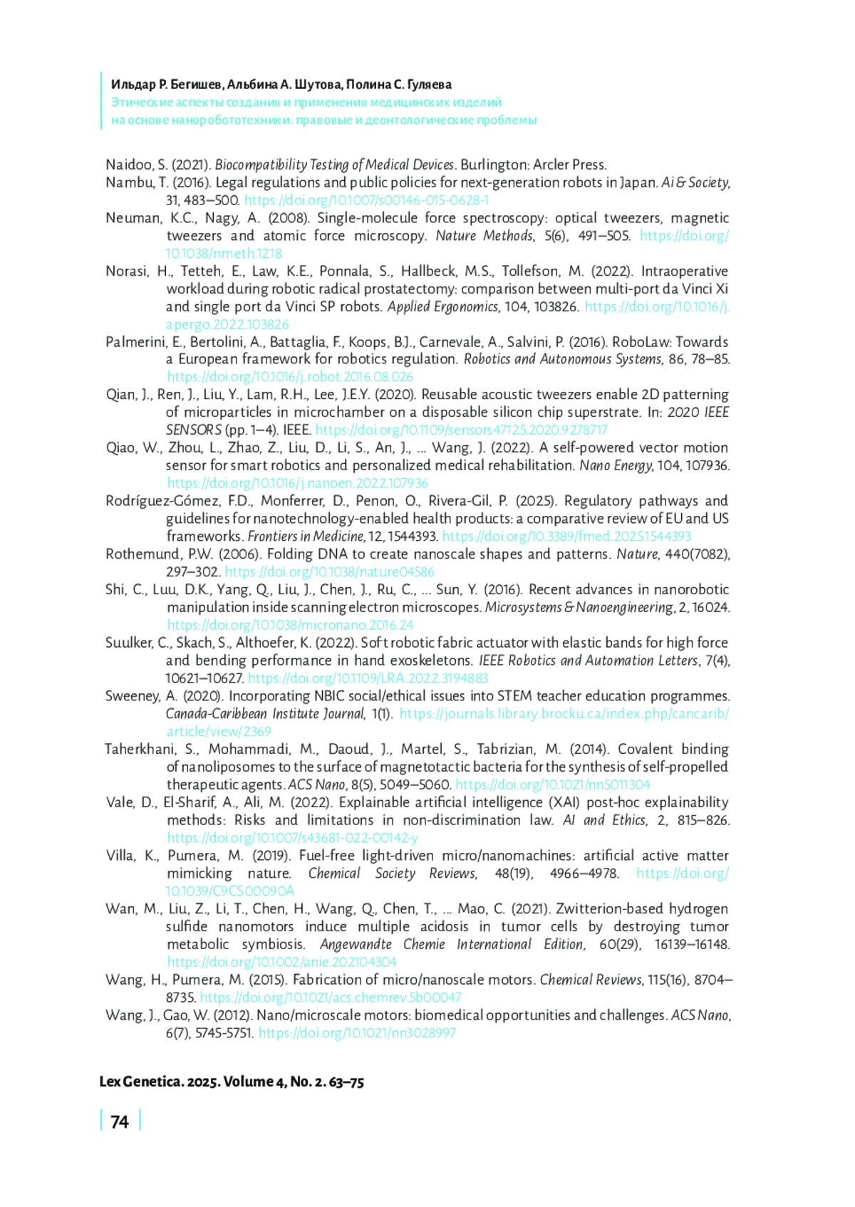 ↑4. Гуляева, П.С. (2023). Медицинские нанороботы в фокусе права. Journal of Digital Technologies and Law, 1(1), 89-122. https://doi.org/10.21202/jdtl.2023.4