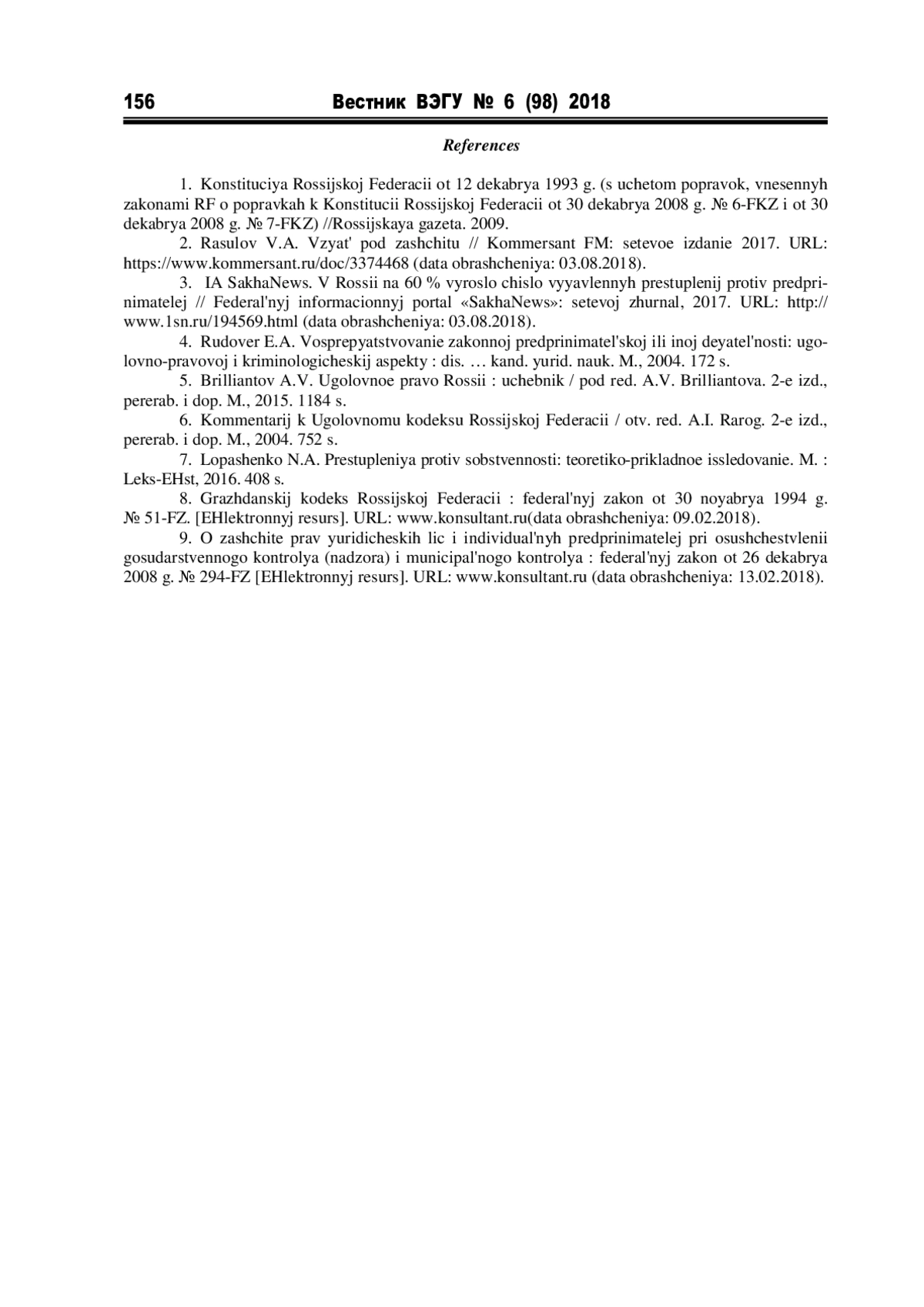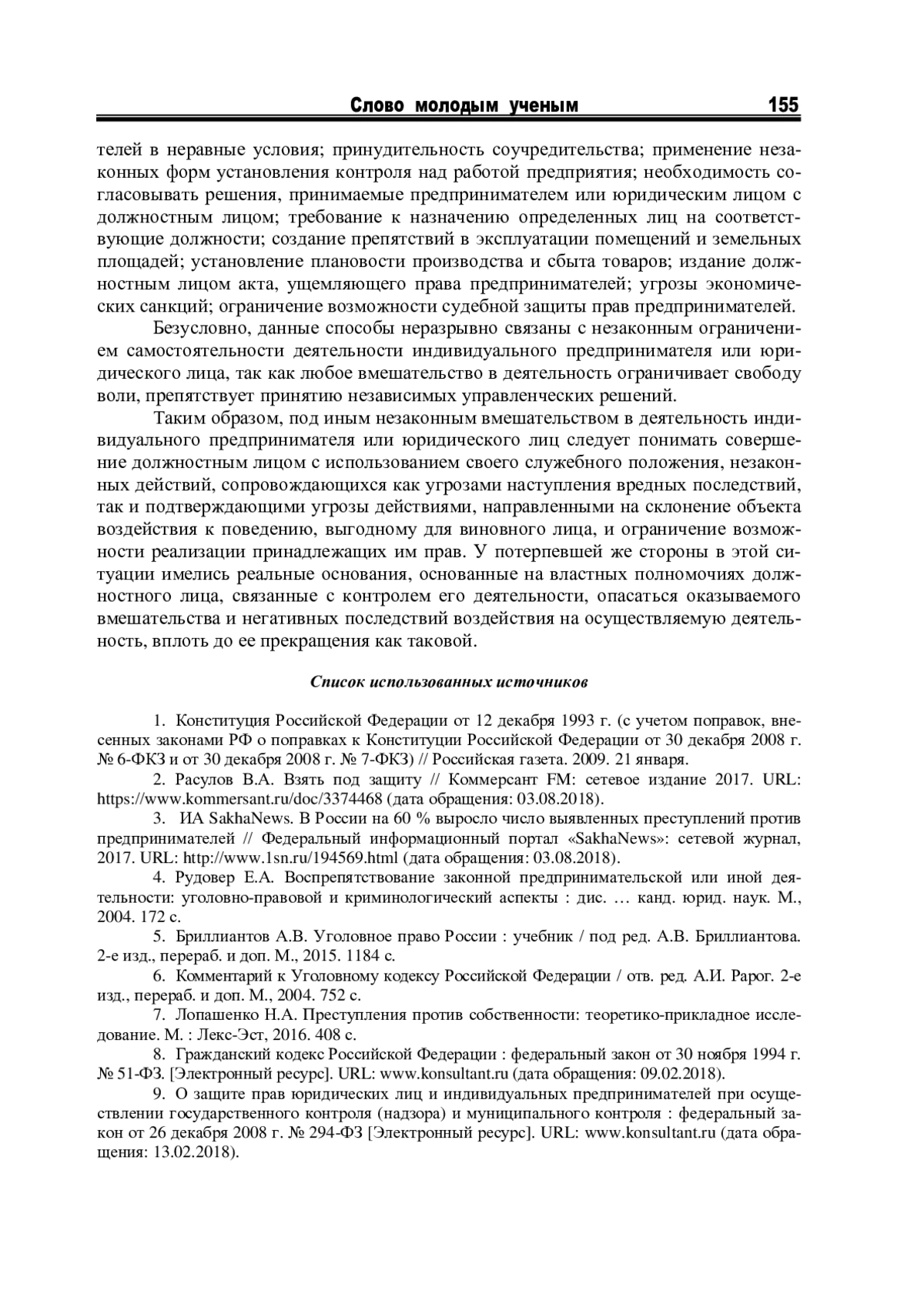 3. ИА SakhaNews. В России на 60 % выросло число выявленных преступлений против предпринимателей // Федеральный информационный портал «SakhaNews»: сетевой журнал, 2017. URL: http://www.1sn.ru/194569.html (дата обращения: 03.08.2018).