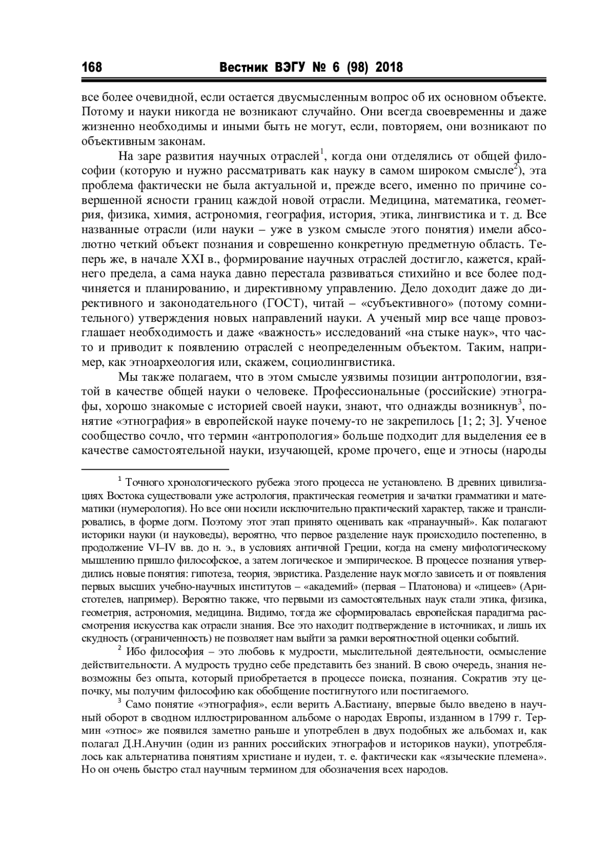 Науковедческой аксиомой следует считать безусловную необходимость для любой научной отрасли иметь ясный объект и предмет изучения. Этнология таким объектом обладает. Это этнос. Но из истории науки мы знаем, что у этнологии богатая преамбула и этапами ее становления были и географические открытия, и колонизация (империализм), и миссионерское богословие, чистая эмпирика ранних ученых. Имея, таким образом, корни и на востоке, и на западе, этнология как наука начала оформляться в Европе, а завершился процесс только в России. В Европе же утвердилась другая наука – антропология. Разбору объектно-предметных границ этих наук посвяшена данная статья