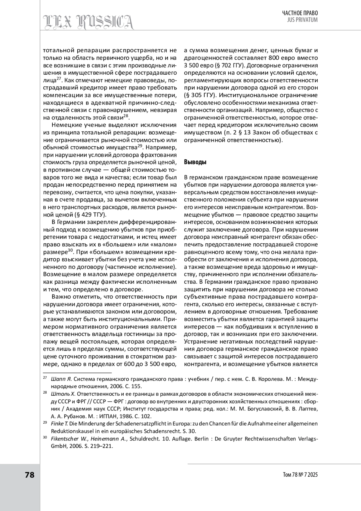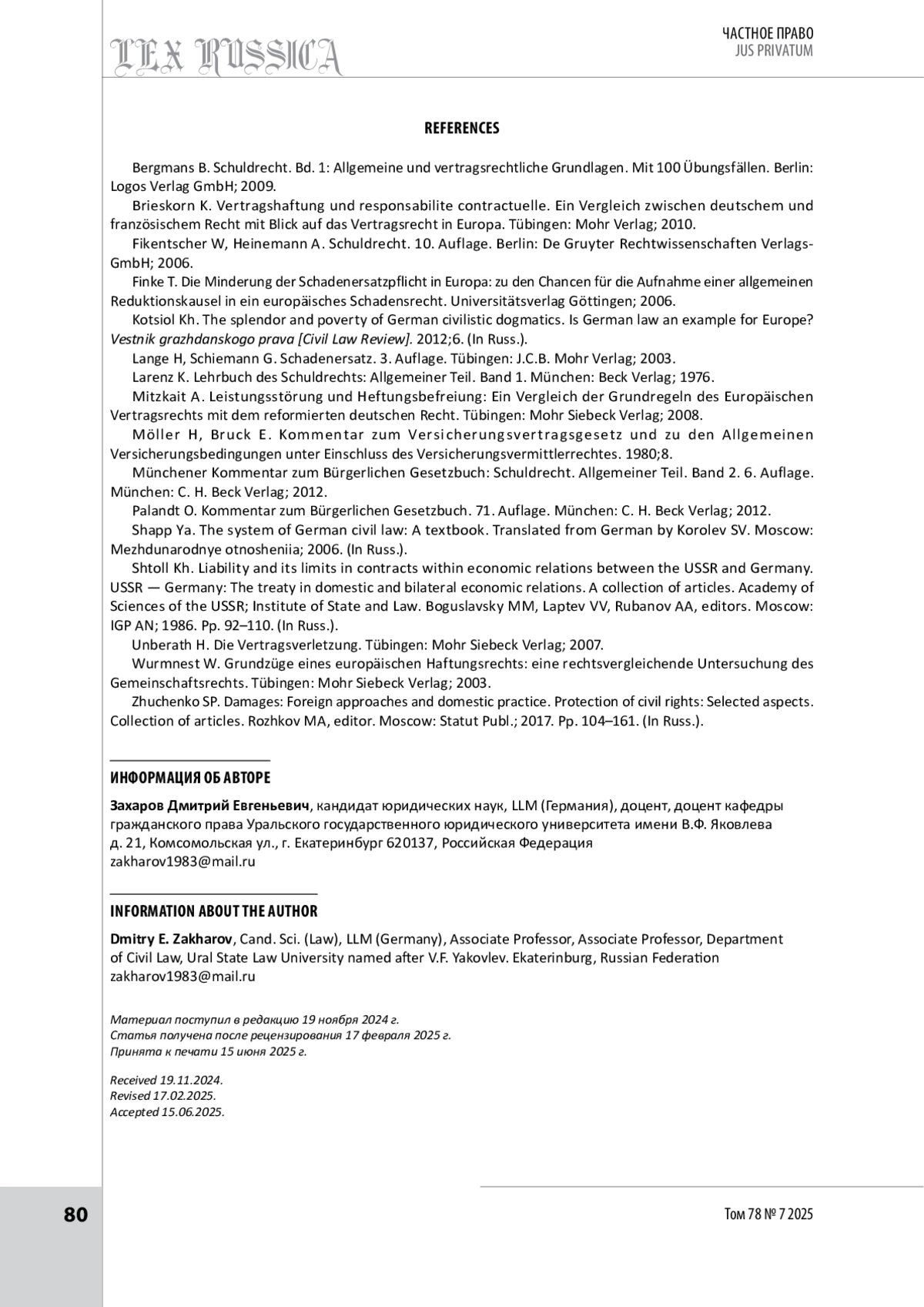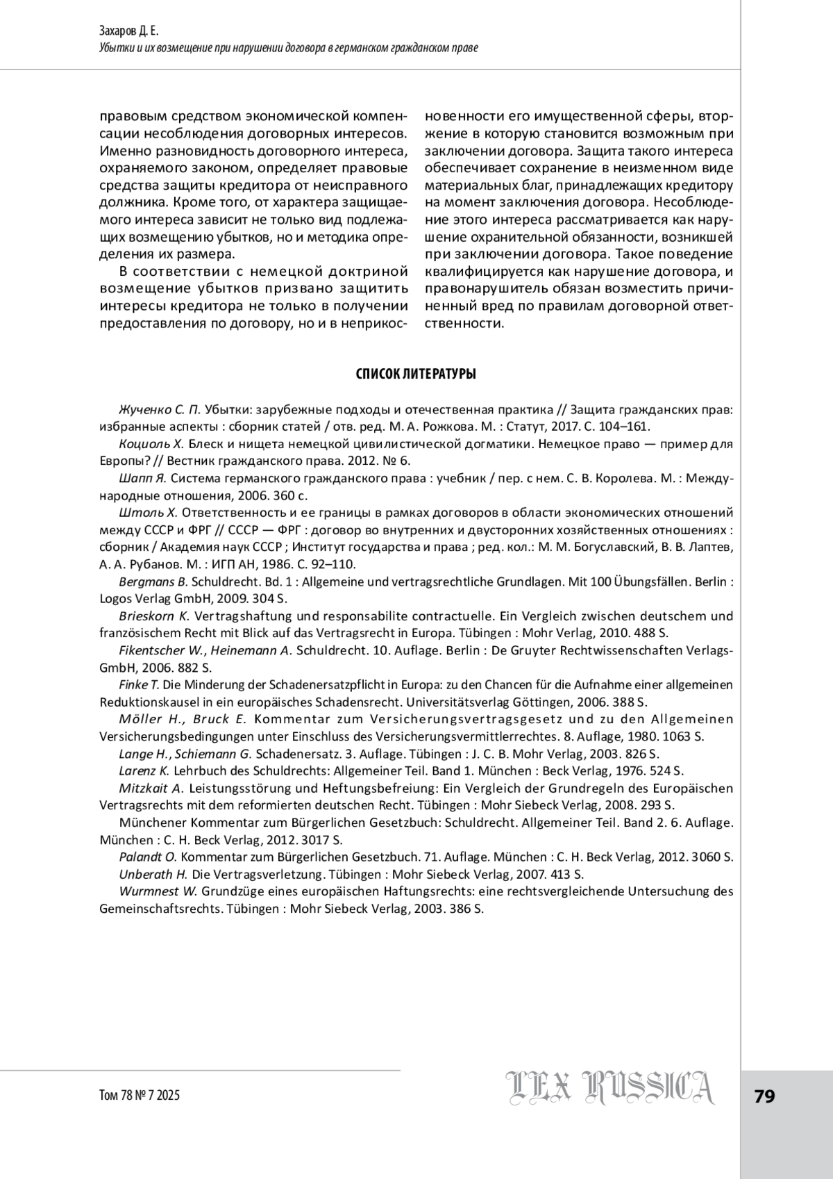 1. Жученко С. П. Убытки: зарубежные подходы и отечественная практика // Защита гражданских прав: избранные аспекты : сборник статей / отв. ред. М. А. Рожкова. М. : Статут, 2017. С. 104-161.