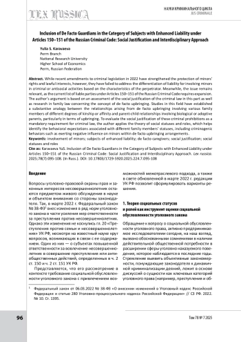 В свете усиления уголовно-правовой охраны прав и законных интересов несовершеннолетних в уголовный закон в 2022 г. были внесены изменения, не коснувшиеся, однако, дифференциации ответственности за вовлечение несовершеннолетних в совершение преступления или антиобщественных действий по признакам субъекта. Между тем проблема представляется актуальной, поскольку закрепленный в ст. 150–151 УК РФ перечень лиц нуждается в расширении. Аргументация автора строится на оценке социальной обусловленности уголовного закона в данной части и исследованиях представителей семейно-правовой науки, обращающихся к понятию фактического воспитания. В рамках указанных исследований установлена содержательная аналогия отношений по фактическому воспитанию несовершеннолетних с участием других членов семьи различной степени родства или свойства́ и детско-родительских отношений с участием биологических или юридических родителей, в том числе в части воспитания. Что касается оценки рассматриваемых уголовно-правовых запретов с точки зрения социальной обусловленности как обязательного требования к уголовному закону, то автор использует теорию социальных статусов и ролей, позволяющую выявить вытекающие из статусов других членов семьи возможности ролевого поведения, включая криминогенные его варианты в виде оказания негативного воздействия на несовершеннолетнего в рамках фактического воспитания.