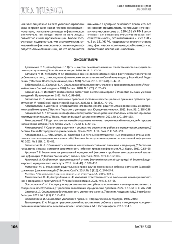 1. Артеменко Н. В., Шимбарева Н. Г. Дети - жертвы семейного насилия: ответственность за «родительские» преступления // Российская юстиция. 2020. № 12. С. 47-51.