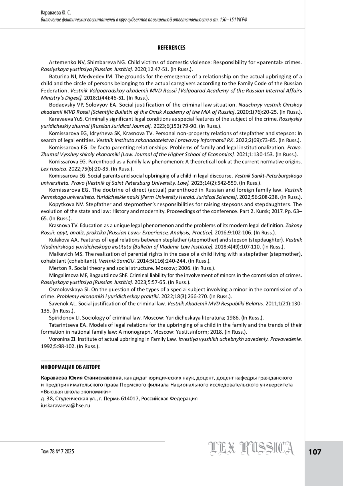 7. Комиссарова Е. Г. Отношения по фактическому воспитанию ребенка: проблемы семейно-правовой институционализации // Право. Журнал Высшей школы экономики. 2021. № 1. С. 130-153.