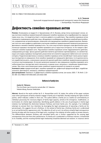 Основываясь на трудах О. А. Красавчикова и В. Б. Исакова, автор статьи анализирует случаи, когда участники семейных правоотношений совершают семейно-правовые акты недобросовестно, нарушая права иных лиц, что свидетельствует о наличии дефекта в их действиях. Под семейно-правовым актом понимается правомерное действие лица, обладающего необходимым объемом семейной дееспособности, направленное на возникновение, изменение или прекращение семейного правоотношения. Выявление того или иного дефекта в действиях участников семейных правоотношений позволило разграничить фиктивные и мнимые семейно-правовые акты. Так, если лицо пытается прикрыть свои фактические цели, используя правовые последствия семейно-правового акта в корыстных интересах, то это говорит о фиктивности семейно-правового акта. Под мнимым семейно-правовым актом подразумевается действие, совершаемое для вида. Целью данного действия является достижение противоправных, не соответствующих сути нормы правовых последствий, результатом чего является нарушение публичного или частного интереса. Разделению фиктивных и мнимых семейно-правовых актов способствуют также разные правовые последствия их совершения. Если семейно-правовой акт совершается фиктивно, то это должно влечь его недействительность, а возникшее в результате данного действия семейное правоотношение должно считаться неустановившимся. В случаях выявления мнимости при совершении семейно-правового акта неблагоприятные последствия могут возникнуть в рамках иных, связанных с семейными правоотношениями. При этом к восстановлению самих семейных правоотношений это привести не может.