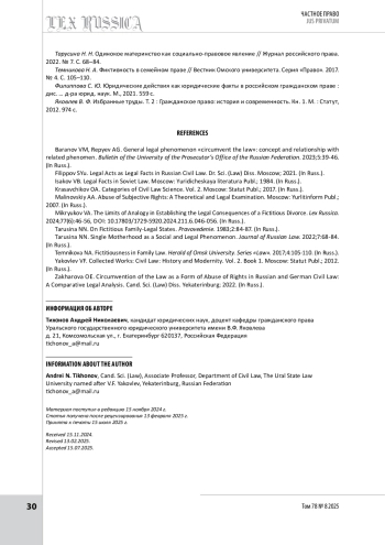 6. Микрюков В. А. Пределы аналогии в установлении правовых последствий фиктивного развода // Lex russica. 2024. № 6. С. 46-56.