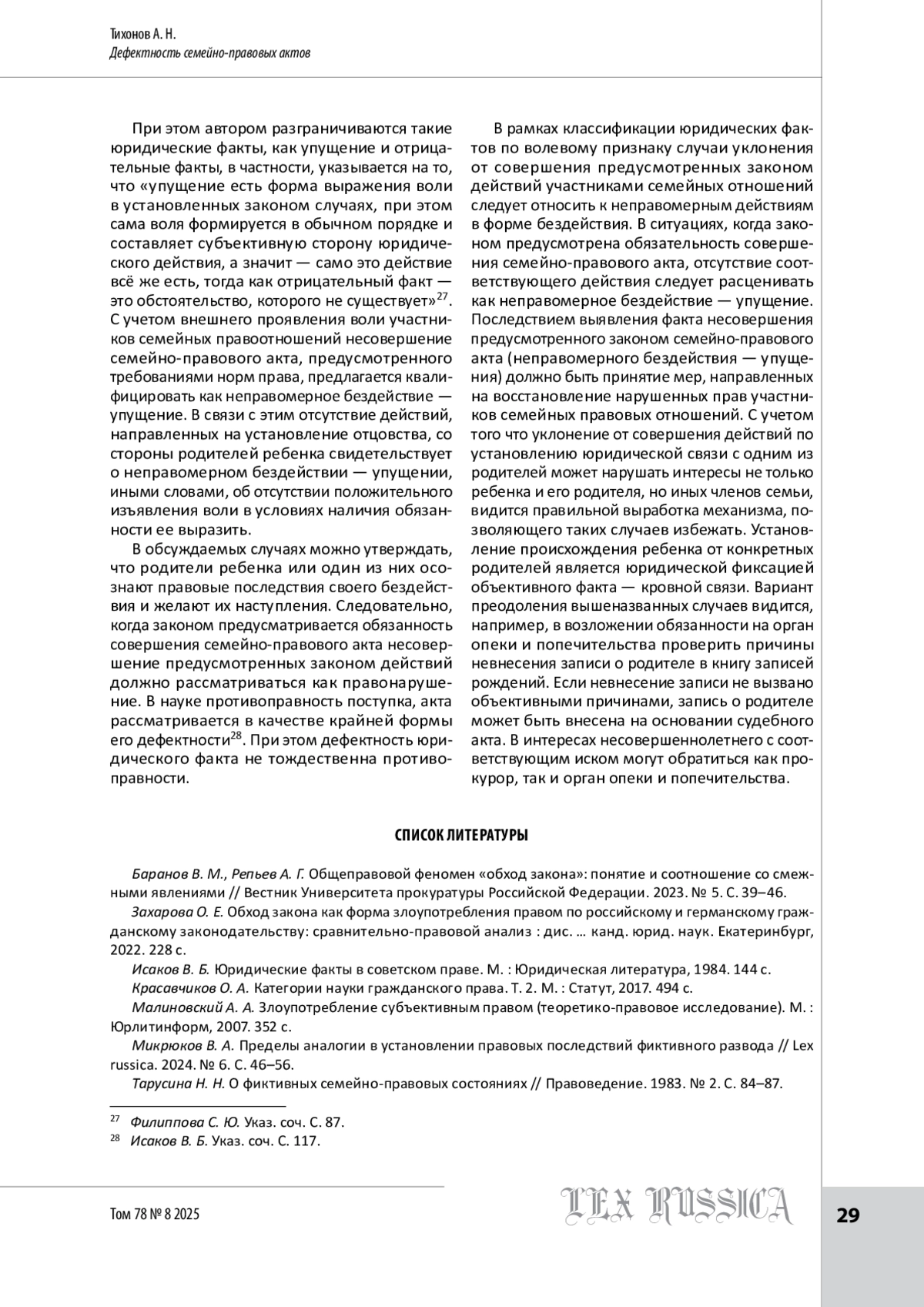 7. Тарусина Н. Н. О фиктивных семейно-правовых состояниях // Правоведение. 1983. № 2. С. 84-87.