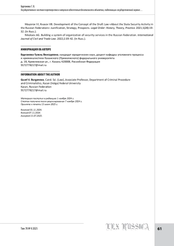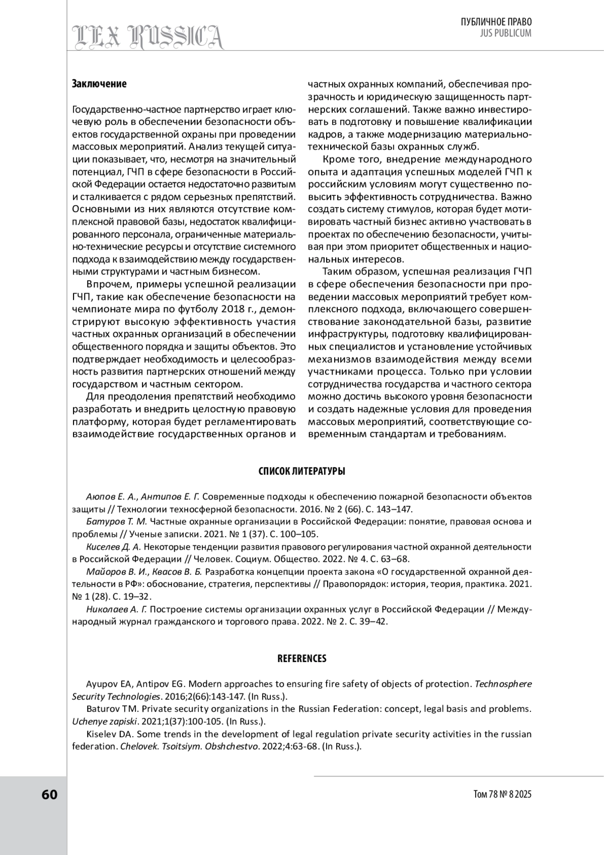 5. Николаев А. Г. Построение системы организации охранных услуг в Российской Федерации // Международный журнал гражданского и торгового права. 2022. № 2. С. 39-42.