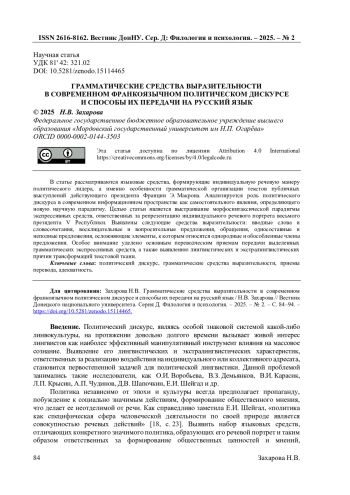 В статье рассматриваются языковые средства, формирующие индивидуальную речевую манеру политического лидера, а именно особенности грамматической организации текстов публичных выступлений действующего президента Франции Э. Макрона. Анализируется роль политического дискурса в современном информационном пространстве как самостоятельного явления, определяющего новую научную парадигму.