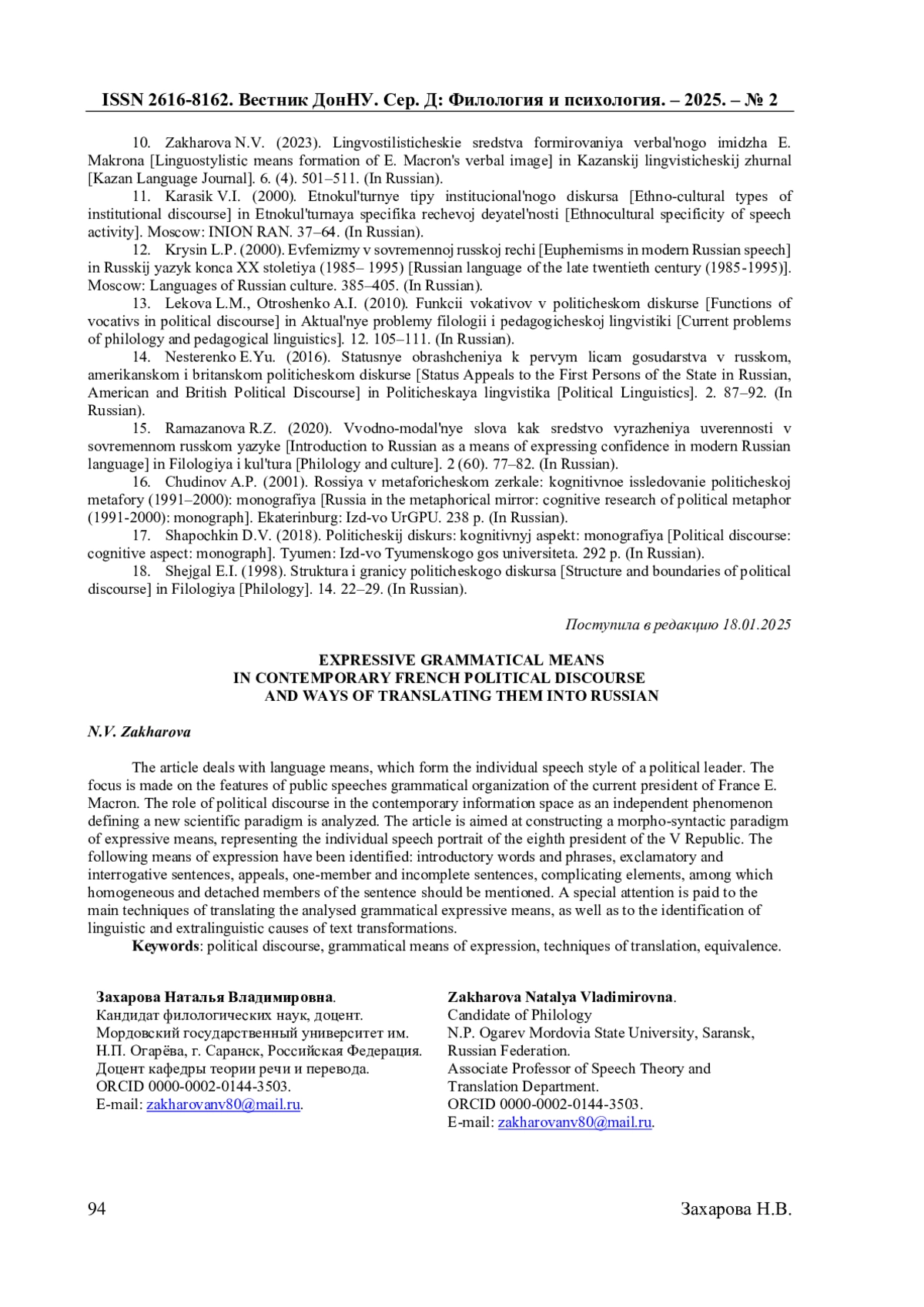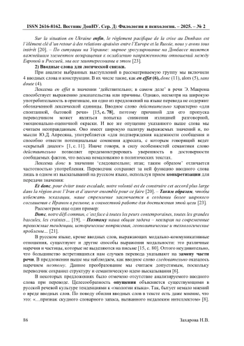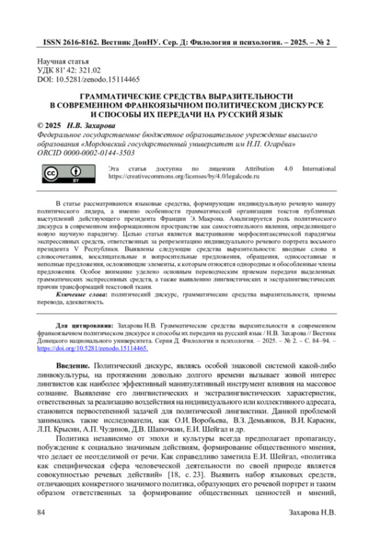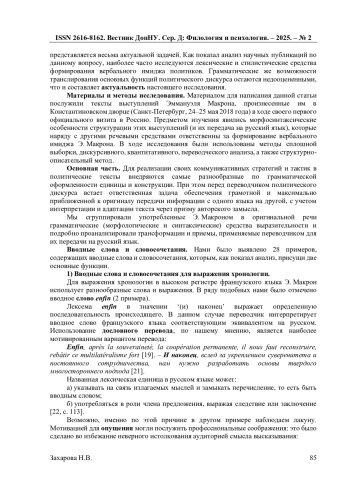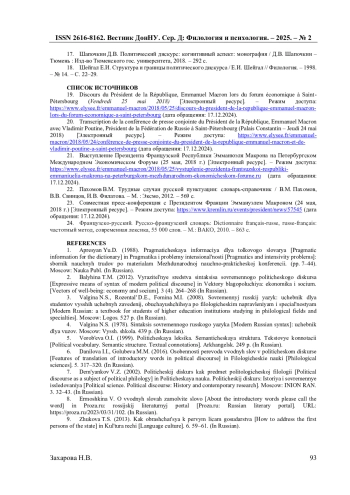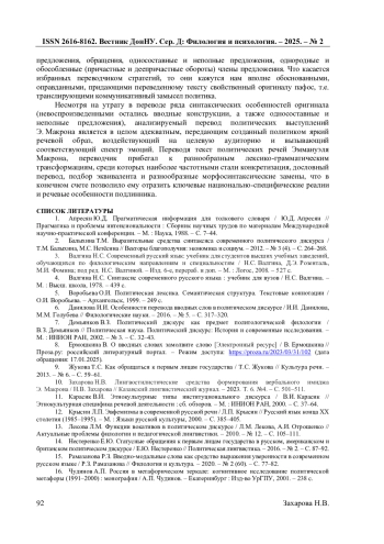 10. Захарова Н.В. Лингвостилистические средства формирования вербального имиджа Э. Макрона / Н.В. Захарова // Казанский лингвистический журнал. - 2023. Т. 6. №4. - С. 501-511. EDN: UFGPQO