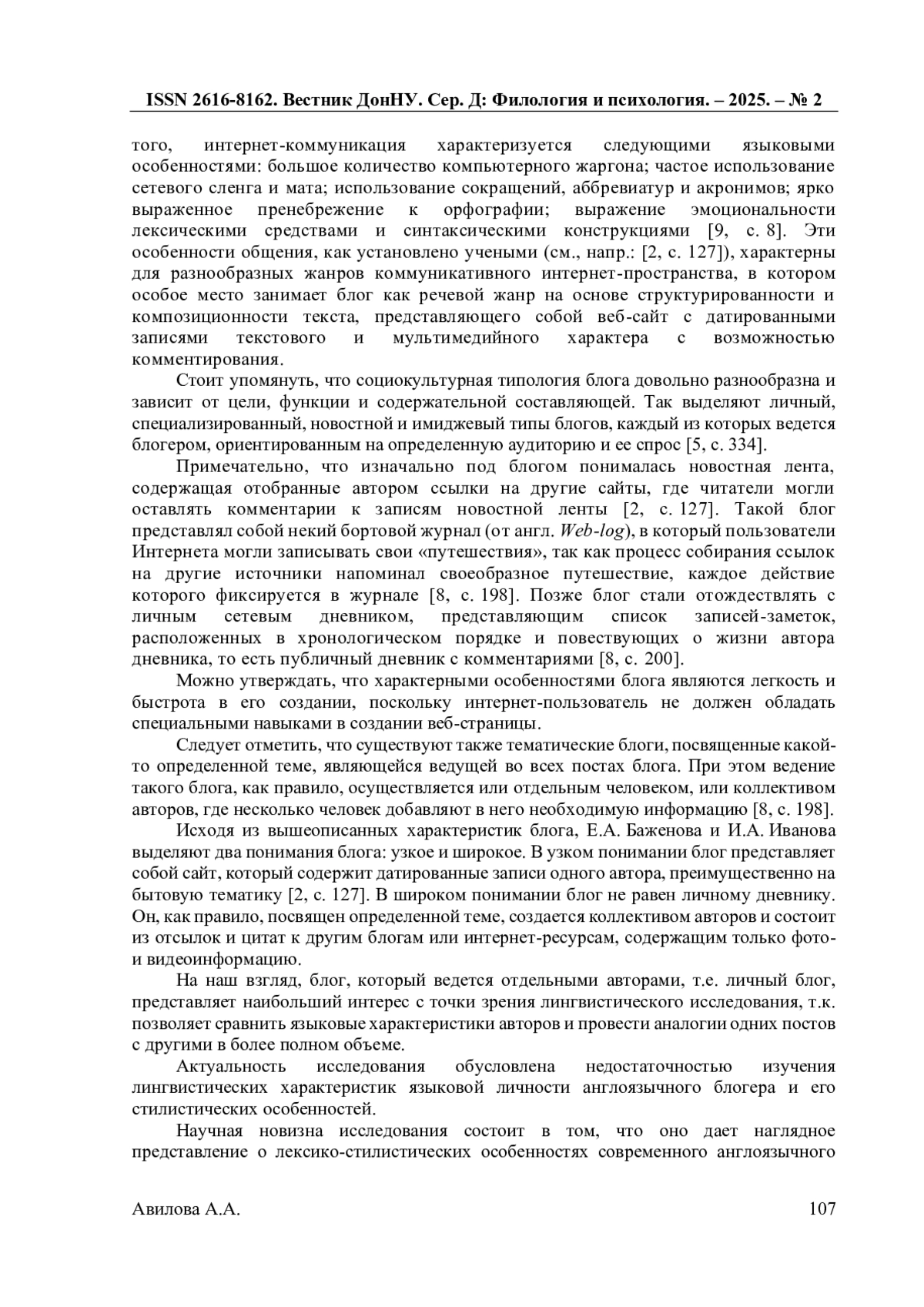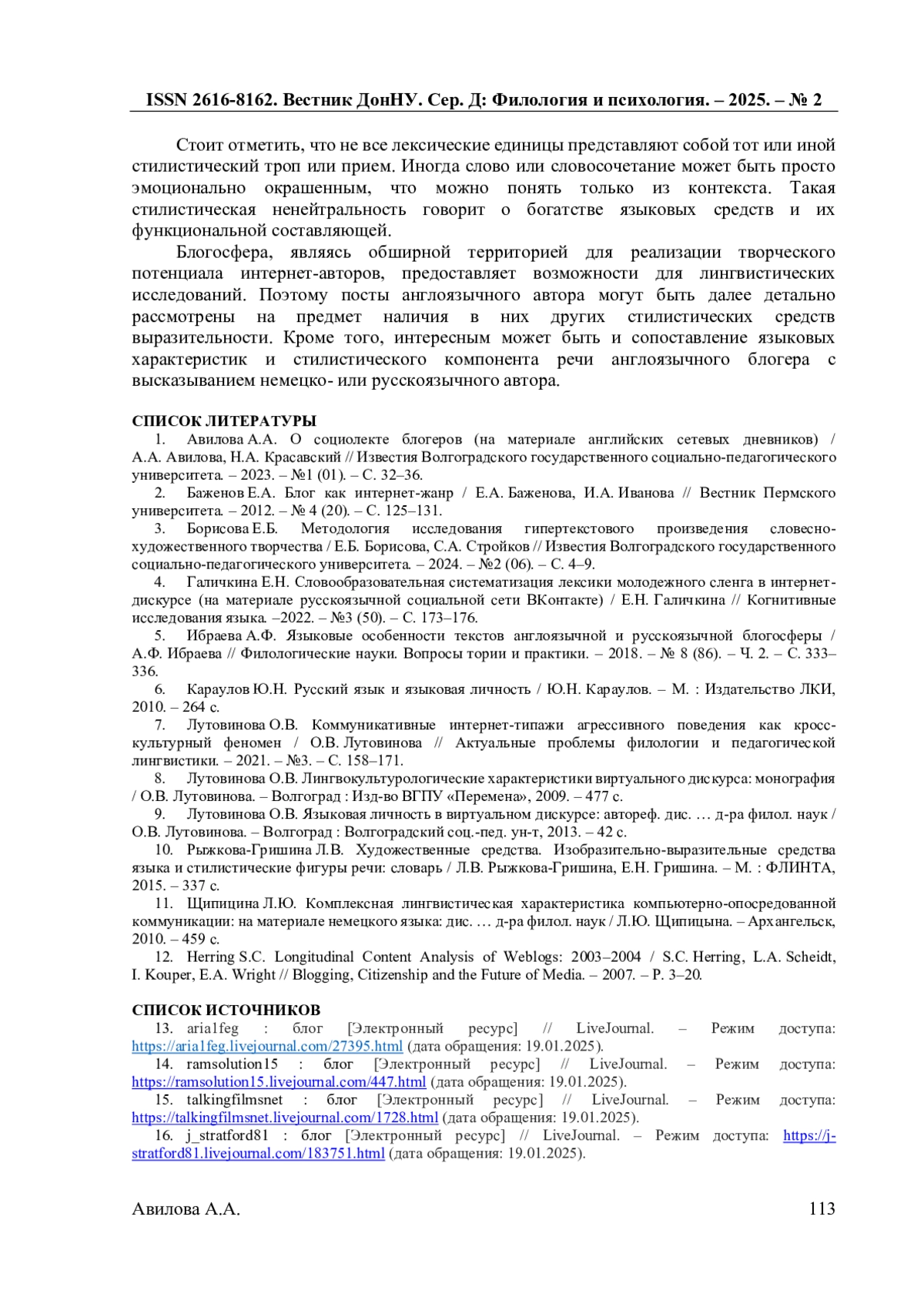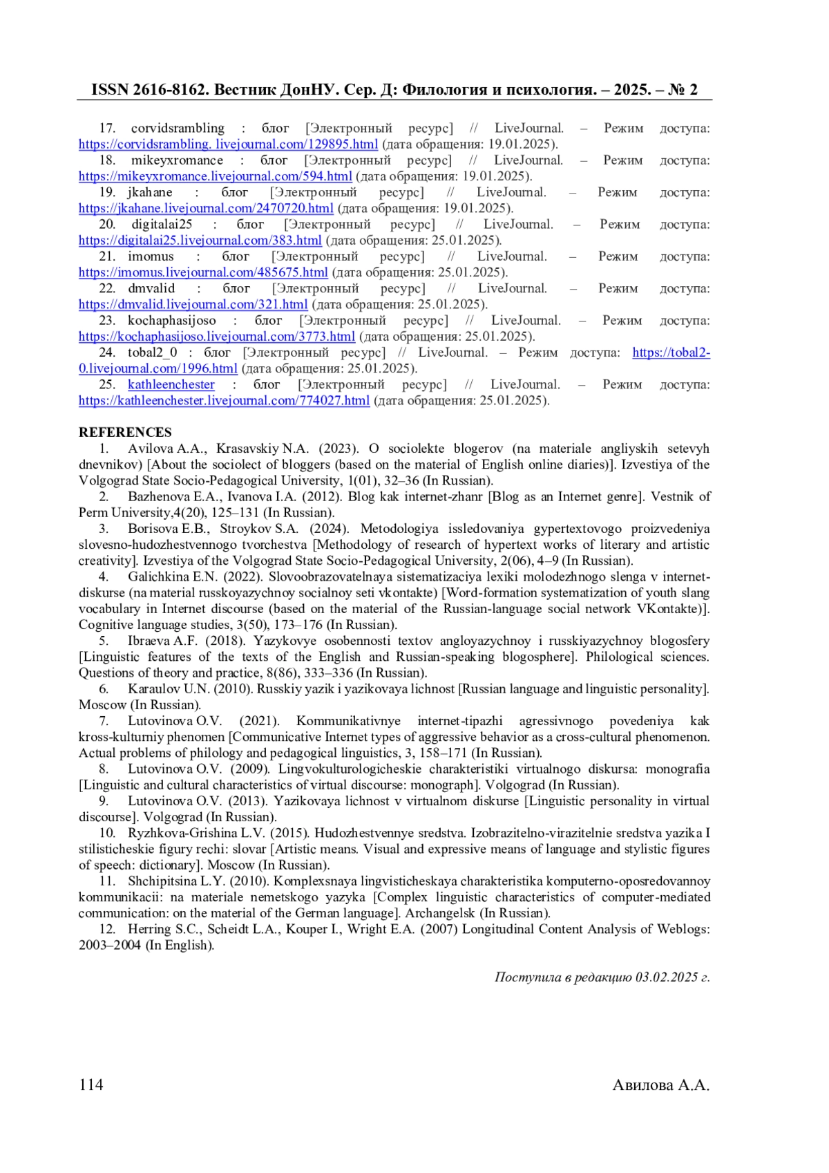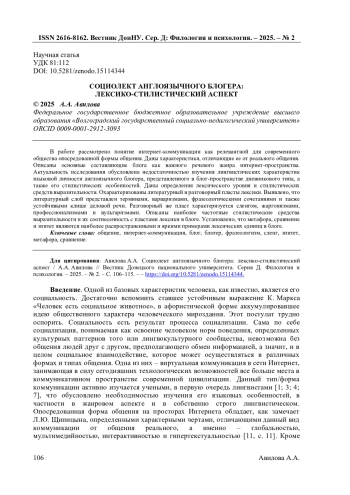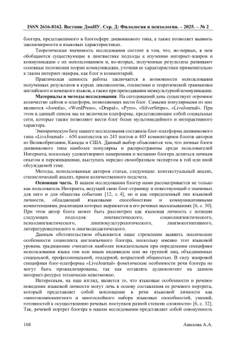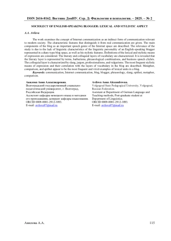 1. Авилова А.А. О социолекте блогеров (на материале английских сетевых дневников) / А.А. Авилова, Н.А. Красавский // Известия Волгоградского государственного социально-педагогического университета. - 2023. - №1 (01). - С. 32-36.