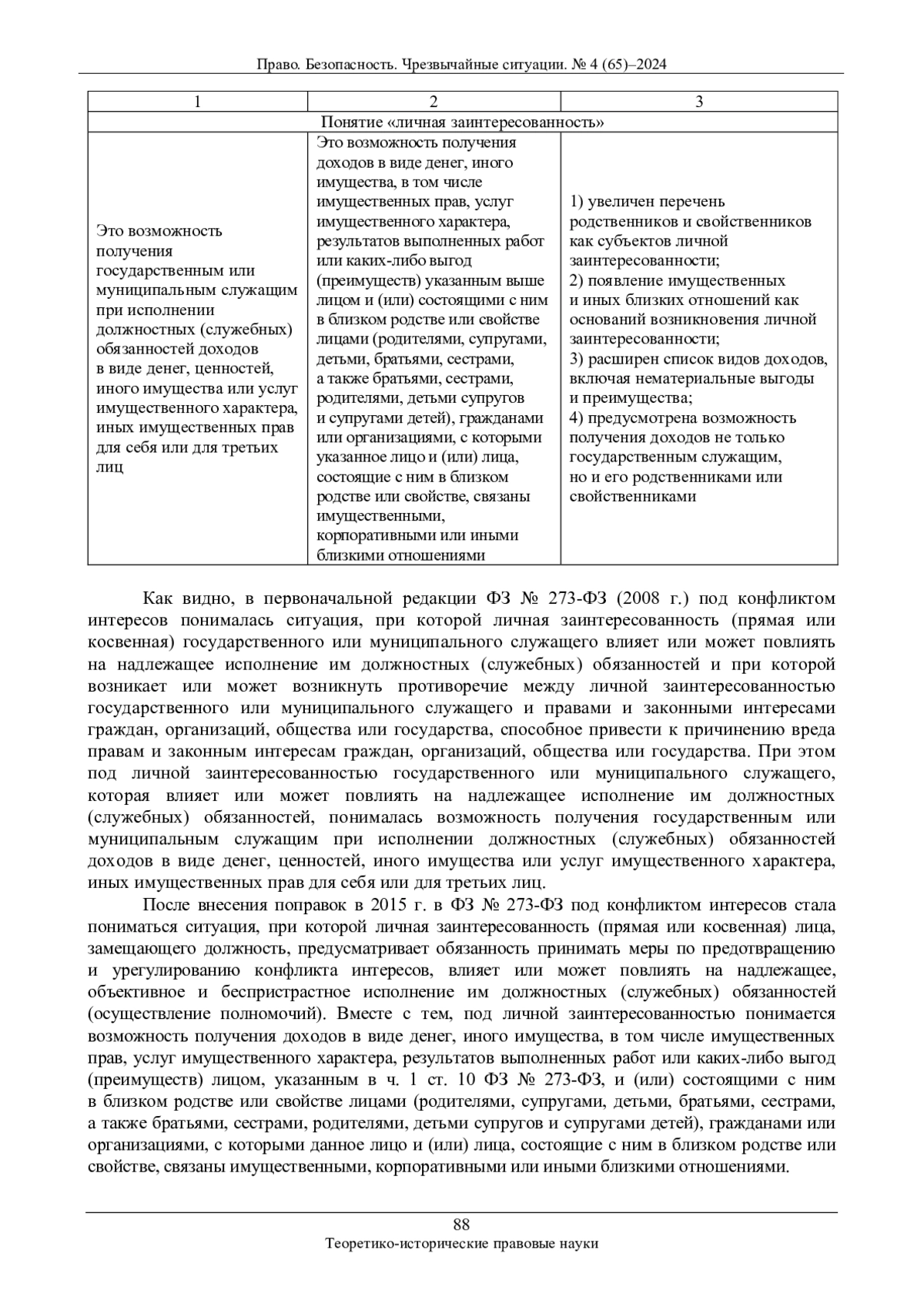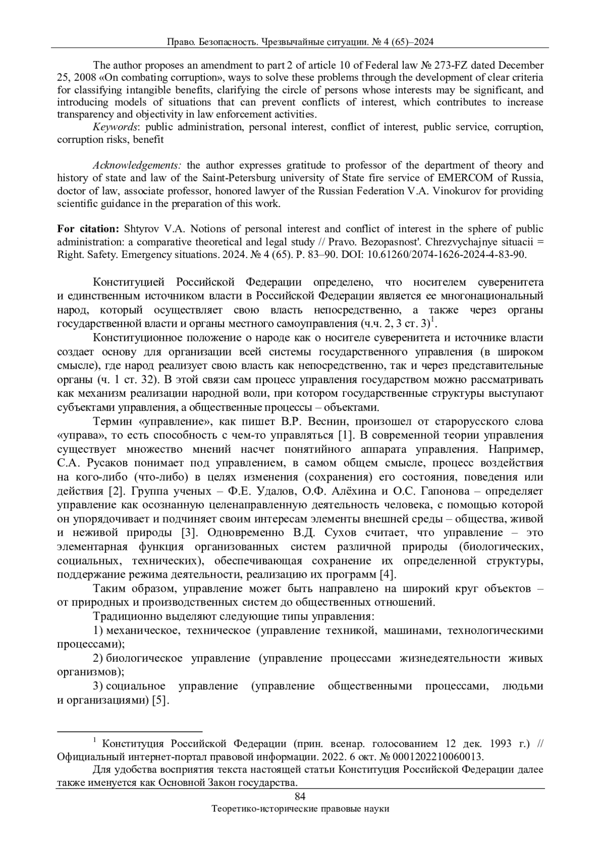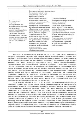 Рассматриваются теоретико-правовые аспекты развития и изменения понятий личной заинтересованности и конфликта интересов в системе государственного управления Российской Федерации. Рассмотрены конституционные и нормативно-правовые нормы государственного управления как механизма, реализующего общественные интересы, а также возможные ситуации, где возникновение личной заинтересованности угрожает объективности решений и требует внедрения эффективных механизмов регулирования для поддержания прозрачности и доверия общества к власти. Особое внимание уделяется правоприменительным трудностям, связанным с неопределенностью категорий нематериальных выгод, круга значимых лиц, а также со сложностями в выявлении потенциального конфликта интересов. Автор предлагает изменение в ч. 2 ст. 10 Федерального закона от 25 декабря 2008 г. № 273-ФЗ «О противодействии коррупции», пути решения данных проблем через разработку четких критериев для классификации нематериальных выгод, уточнение круга лиц, чьи интересы могут быть значимыми, и введение моделей ситуаций, способных предотвратить конфликты интересов, что способствует повышению прозрачности и объективности в правоприменительной деятельности.