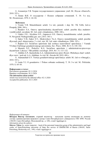 7. Алехин А.П., Кармолицкий А.А. Административное право России. Общая часть: учеб. для вузов / под ред. А.А. Алехина. 4-е изд. М.: Зерцало-М, 2019. 480 c. EDN: XNYQDF