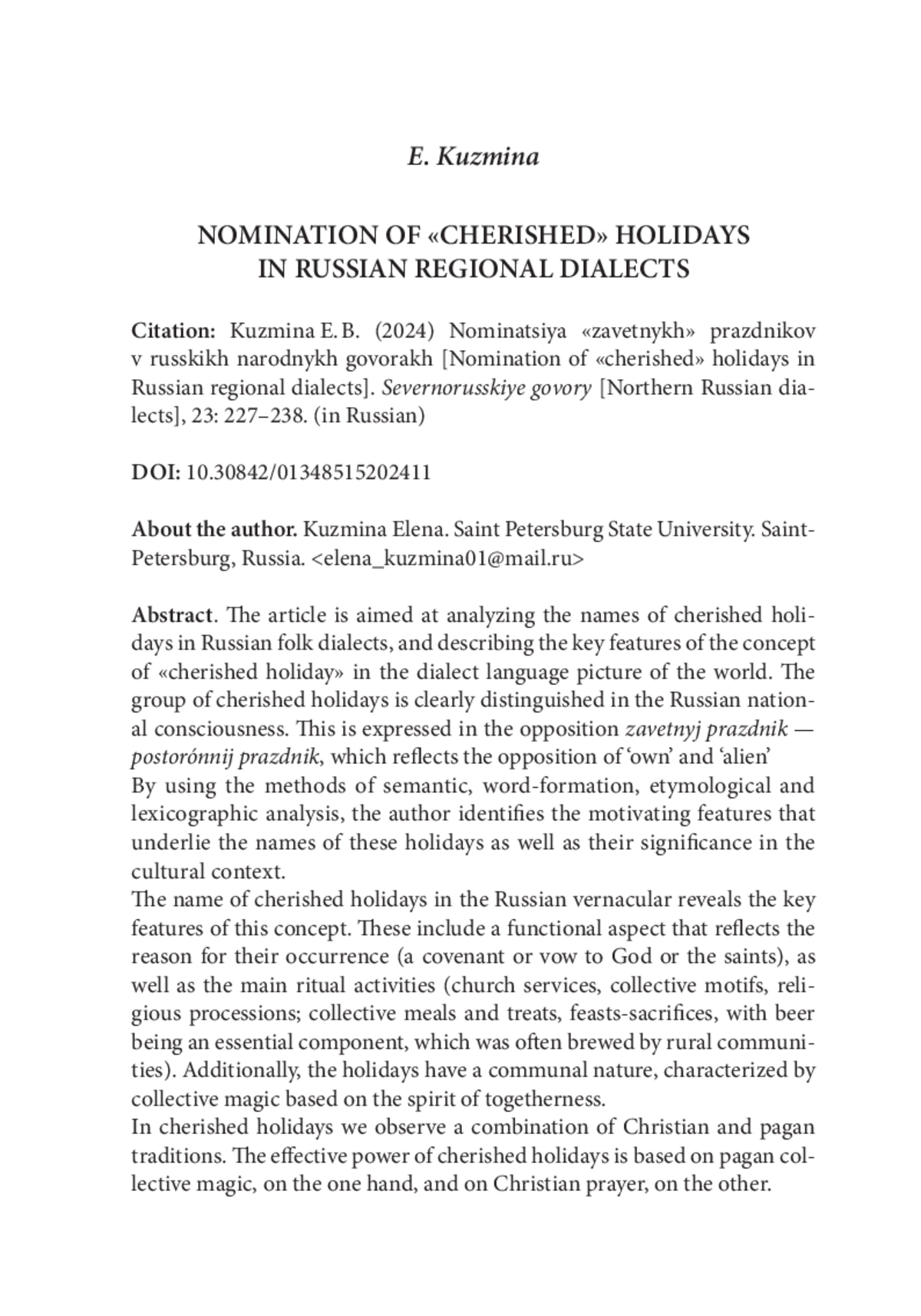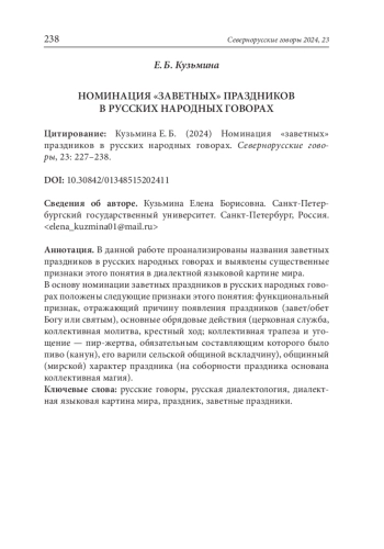 В данной работе проанализированы названия заветных праздников в русских народных говорах и выявлены существенные признаки этого понятия в диалектной языковой картине мира.