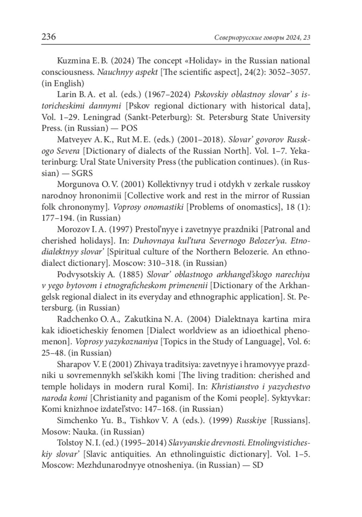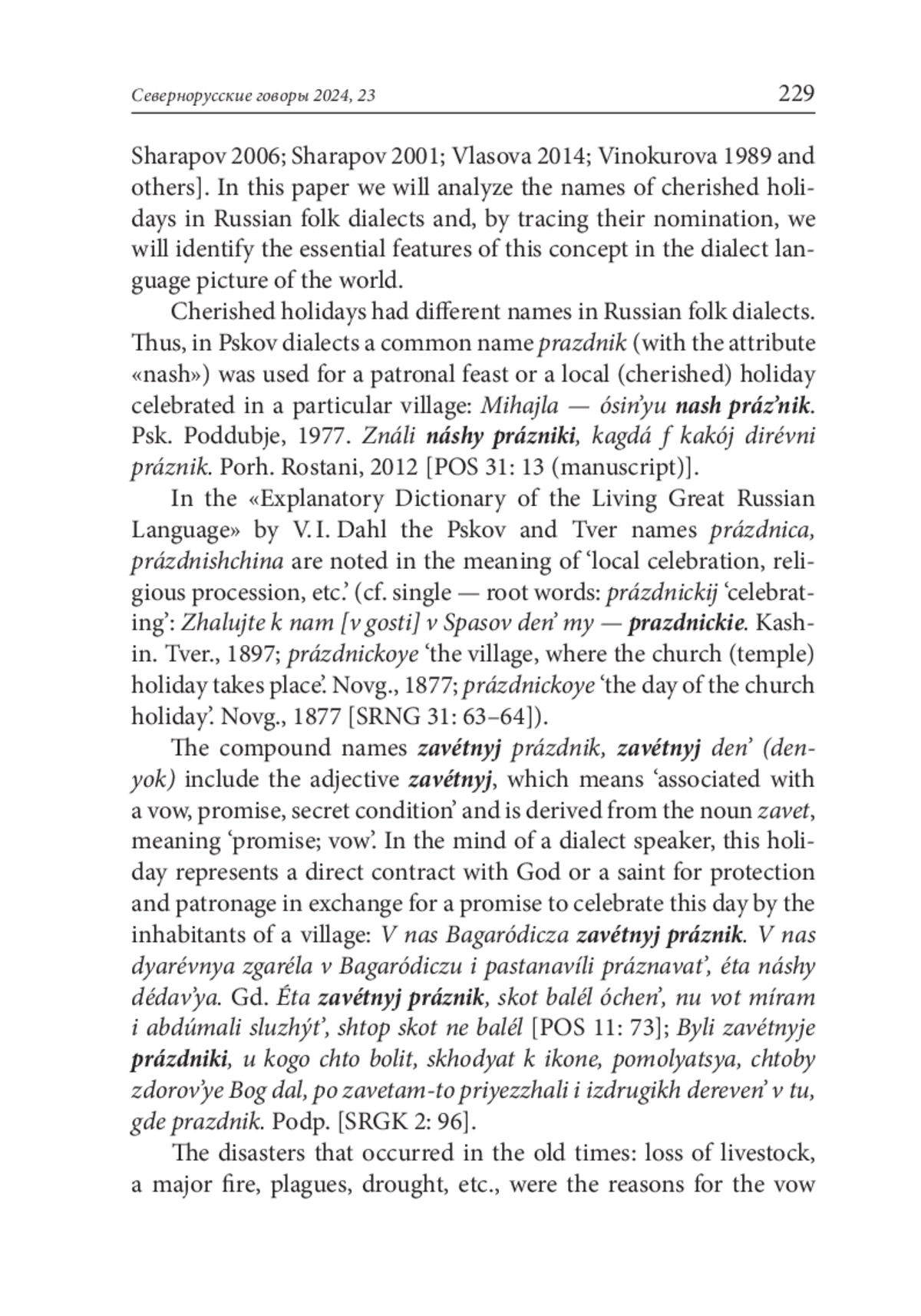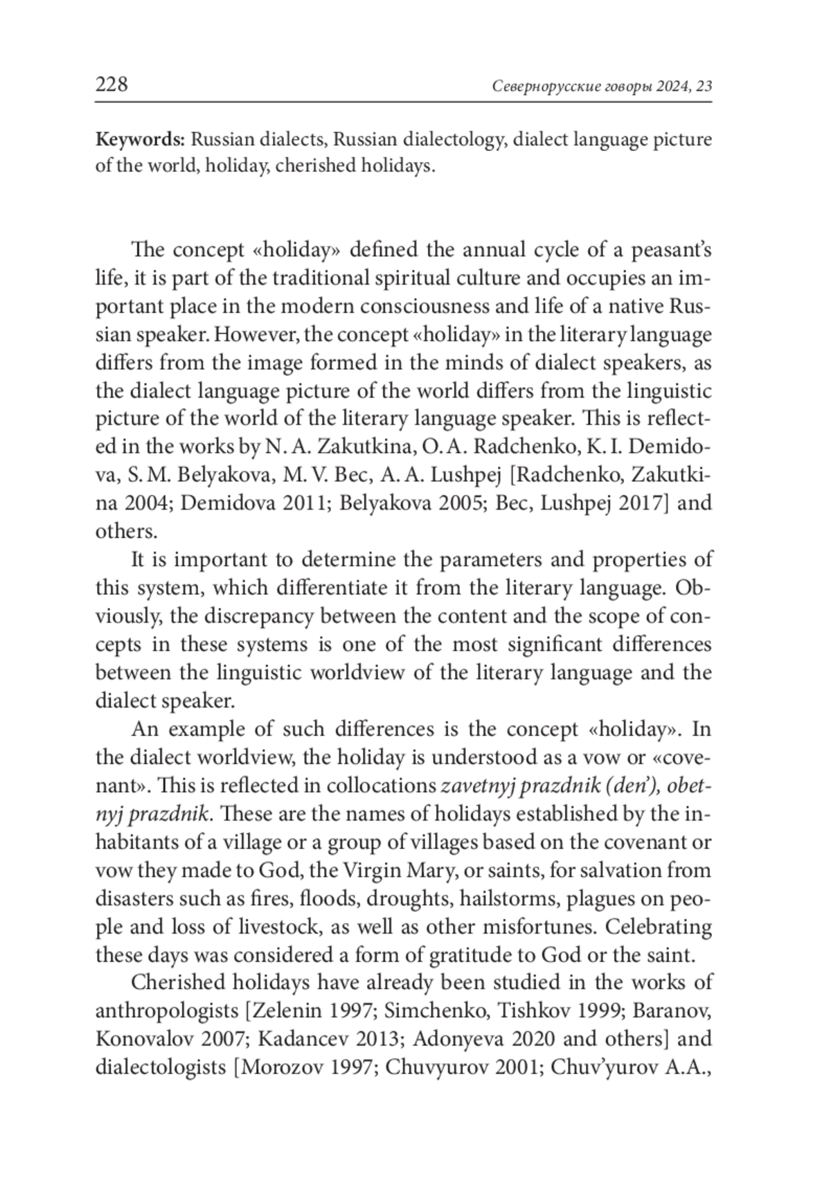 Понятие «праздник» определяло годовой цикл крестьянской жизни, является частью традиционной духовной культуры и занимает важное место в современном сознании и жизни носителя русского языка. Однако понятие «праздник» в литературном языке отличается от образа, сложившегося в сознании носителей диалектов, поскольку диалектная языковая картина мира отличается от языковой картины мира носителя литературного языка. Это отражено в работах Н. А. Закутской, О. А. Радченко, К. И. Демидовой, С. М. Беляковой, М. В. Бека, А. А. Лушпей [Радченко, Закутская 2004; Демидова 2011; Белякова 2005; Бек, Лушпей 2017] и других.