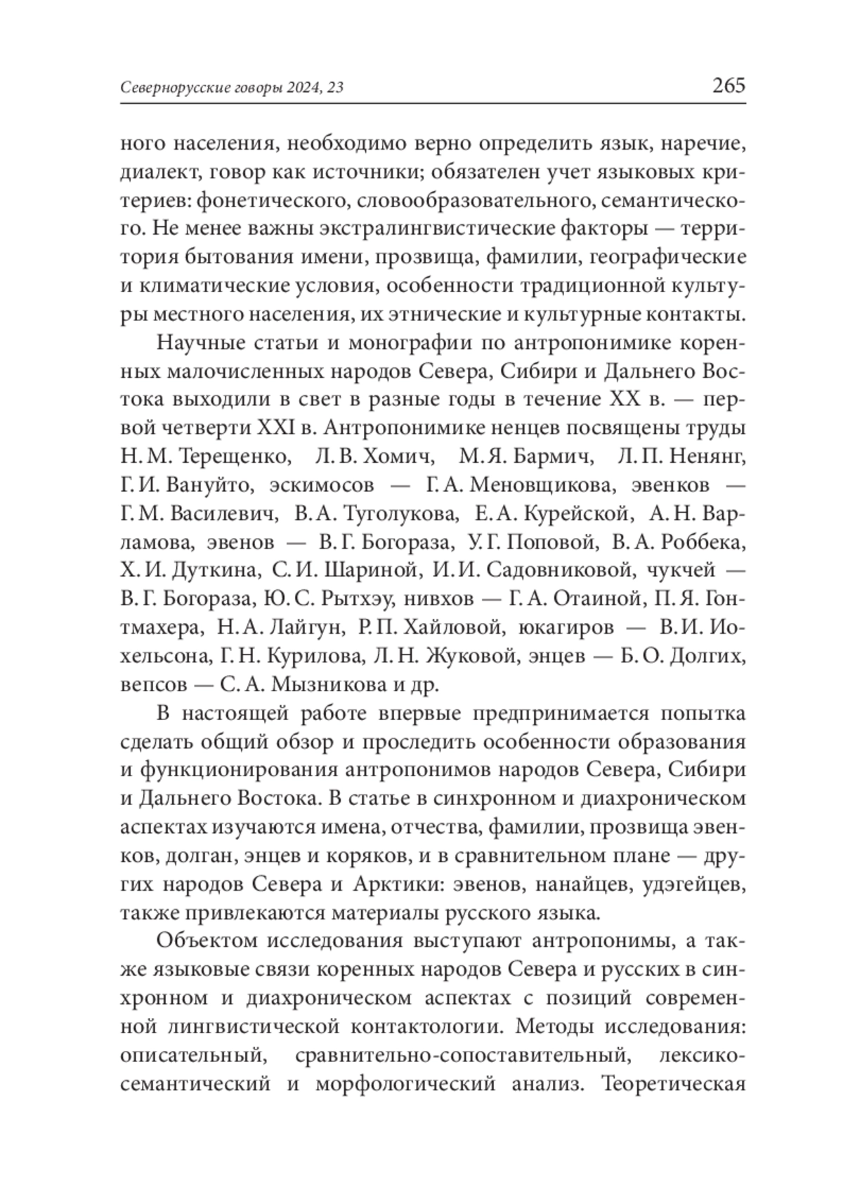 Материалом статьи послужили наблюдения автора, беседы со студентами и преподавателями Института народов Севера РГПУ им. А. И. Герцена — носителями родных языков и этнических культур, а также опубликованные труды по ономастике известных отечественных ученых (тунгусо-маньчжуроведов, тюркологов, уралистов, палеоазиатоведов) и другие источники: словари, монографии, статьи, учебные пособия по языку, этнографии и фольклору народов Севера и русского населения Сибири и Арктики. Автор приходит к выводам, что имена, фамилии и прозвища народов Севера отличаются большим многообразием, а их происхождение и бытование связаны с особенностями материальной и духовной культуры этносов. Среди экстралингвистических факторов, повлиявших на особенности имянаречения, одним из основных явилось контактирование коренных жителей с русским населением региона, а также древние этнокультурные и языковые контакты КМНССиДВ. Выявлены наиболее употребительные словообразовательные и словоизменительные суффиксы, участвующие в образовании имен; в заимствованных словах обнаруживаются прежде всего фонетические и лексические различия.