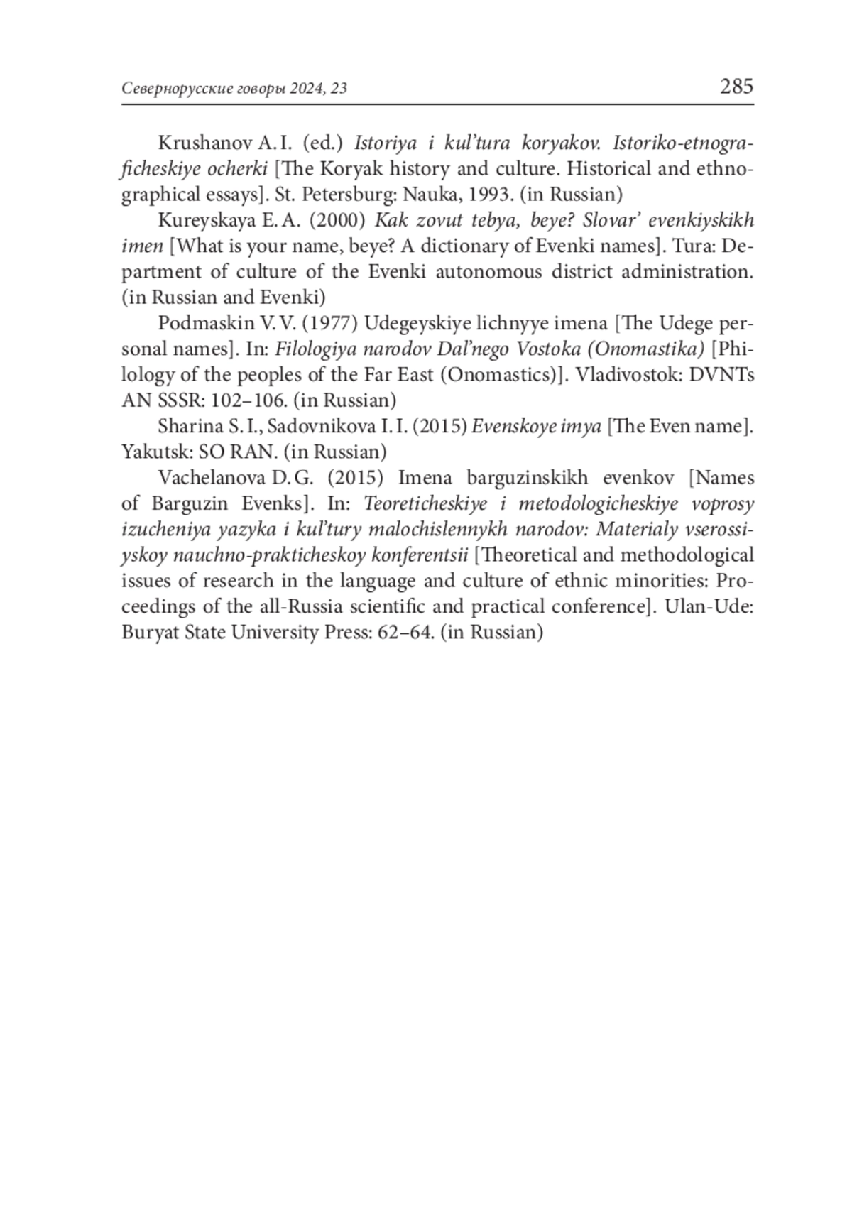 7. Шарина С. И., Садовникова И. И. (2015) Эвенское имя. Якутск: ИГИиПМНС СО РАН.