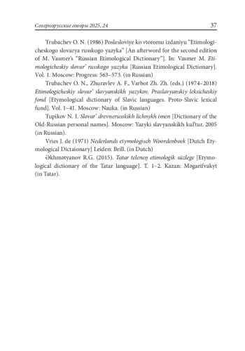 7. Трубачев О. Н. (1986) Послесловие ко второму изданию «Этимологического словаря русского языка» М. Фасмера. В: Фасмер М. Этимологический словарь русского языка. Т. 1. М.: Прогресс: 563-573.