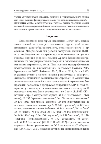 Данная работа посвящена некоторым аспектам номинаций на почве севернорусских говоров и смежных финно-угорских языков. Материалами для работы послужили данные полевого лингвогеографического обследования автора и разнообразных лексикографических источников. Отмечается, что на восточнославянской почве доминирует единица стрекоза, а в русских диалектах представлены фиксации слов стрела, стрелка, коромысло и др. В разговорном языке XVIII–XIX вв. отмечается употребление слова стрекоза для наименования как стрекозы, так и кузнечика, что нашло отражение и в художественной литературе. В диалектной лексикографии XIX в. данное смешение представлено на уровне толкований в текстах словарей. Подробно анализируется наименование коромысло ʽстрекозаʼ, делается вывод, что данная лексема является результатом влияния семантической системы прибалтийско-финских языков на севернорусские говоры. На финно-угорской почве имеются версии происхождения некоторых слов, связанных с народной этимологией. В коми языке для наименования стрекозы известно двадцать восемь слов и составных наименований; часть коми наименований соотносится с вепсскими данными. Мотивационные модели в некоторых случаях носят характер, близкий к универсальному, однако для коми данных фиксируется немало уникальных наименований.
