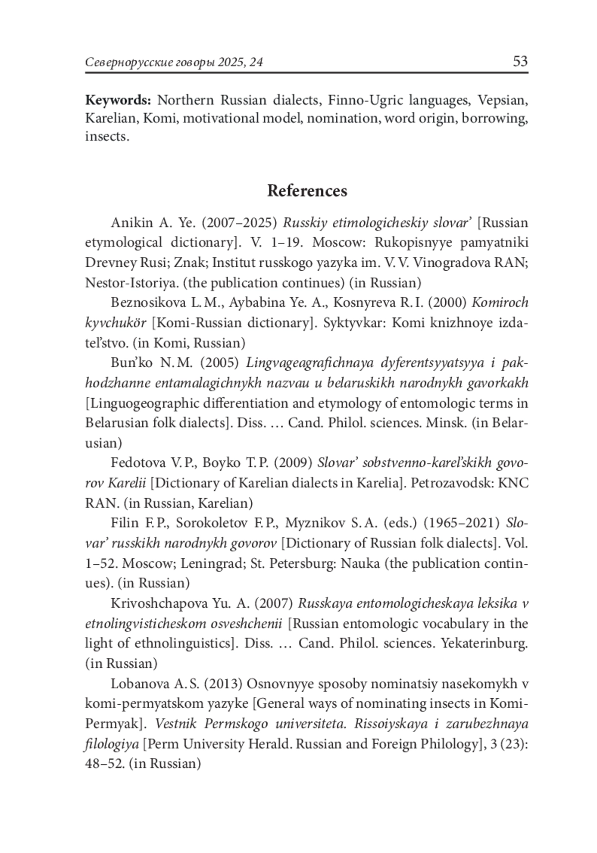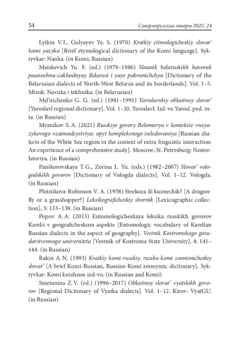 6. Попов А. А. (2013) Энтомологическая лексика русских говоров Карелии в географическом аспекте. Вестник Костромского государственного университета, 4: 141-144.