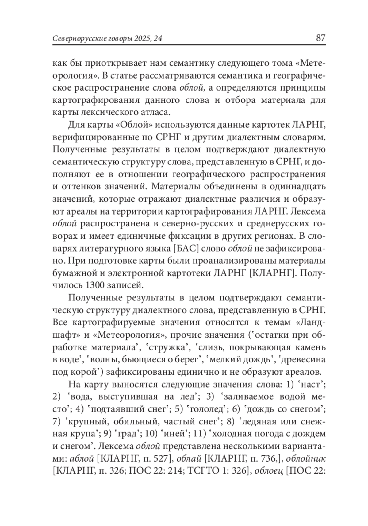 В статье рассматриваются значения слова облой в современных русских народных говорах на материале, собранном для семантической карты «Облой» тома Лексического атласа русских народных говоров (ЛАРНГ) «Ландшафт». Данные картотек ЛАРНГ, СРНГ верифицированы по диалектным словарям. Полученные результаты в целом подтверждают диалектную семантическую структуру слова, представленную в Словаре русских народных говоров, дополняя ее в отношении географического распространения семантических оттенков слова. Слово облой распространено в севернорусских говорах и спорадически фиксируется на всей территории ЛАРНГ. Выделены 12 значений, относящихся к разделам «Ландшафт» и «Метеорология».