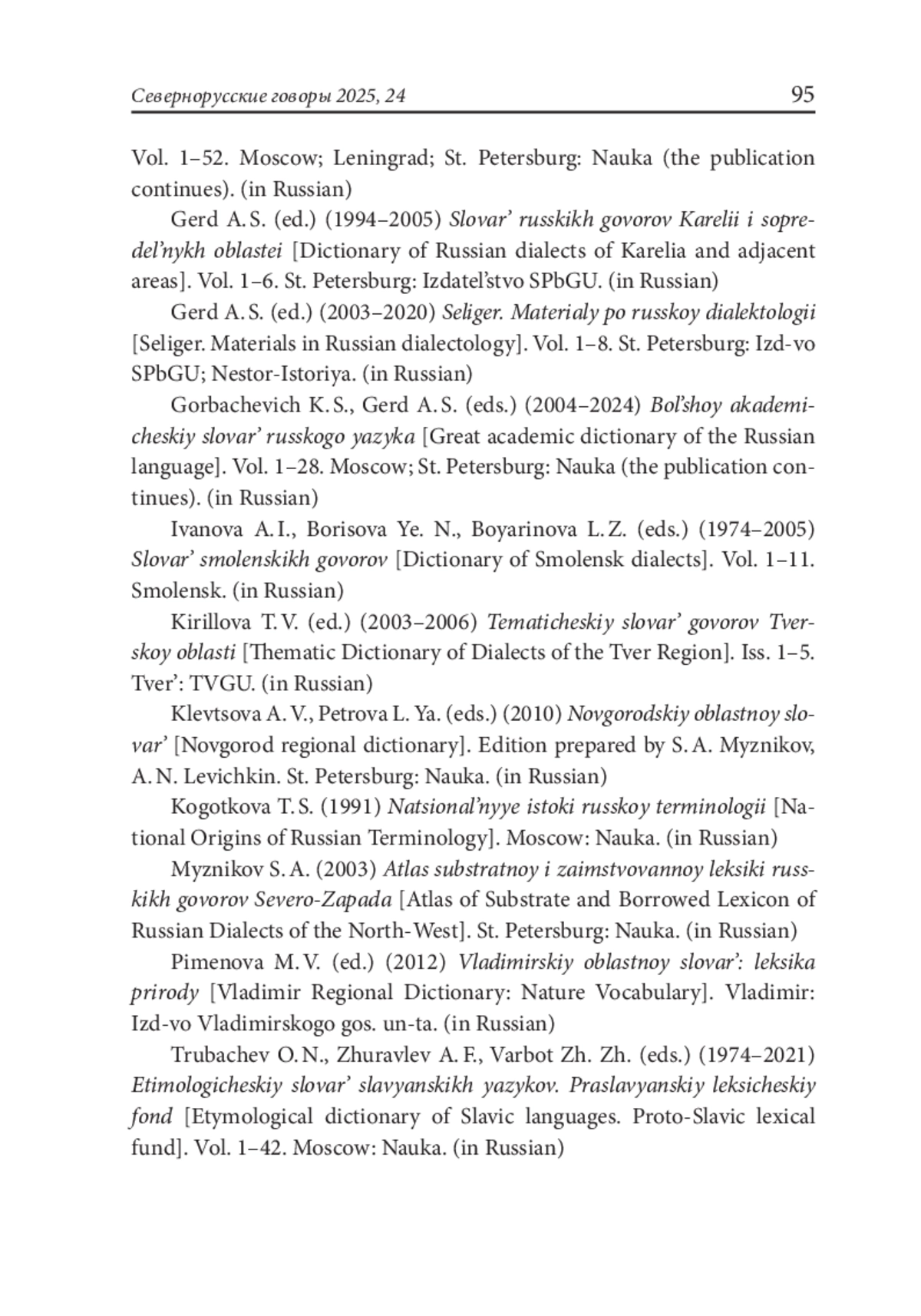 10. Словарь русских народных говоров. Гл. ред. Ф. П. Филин (т. 1-23), Ф. П. Сороколетов (т. 24-46), С. А. Мызников (т. 47-52). Т. 1-52. М.; Л.; СПб.: Наука, 1965-2021 (издание продолжается).