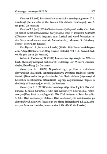 2. Журавлев А. Ф. (2022) Непродуктивные префиксы в восточнославянских диалектах (этимологическая эвристика; трудности идентификации). // Вопросы языкознания, 6: 44-61.